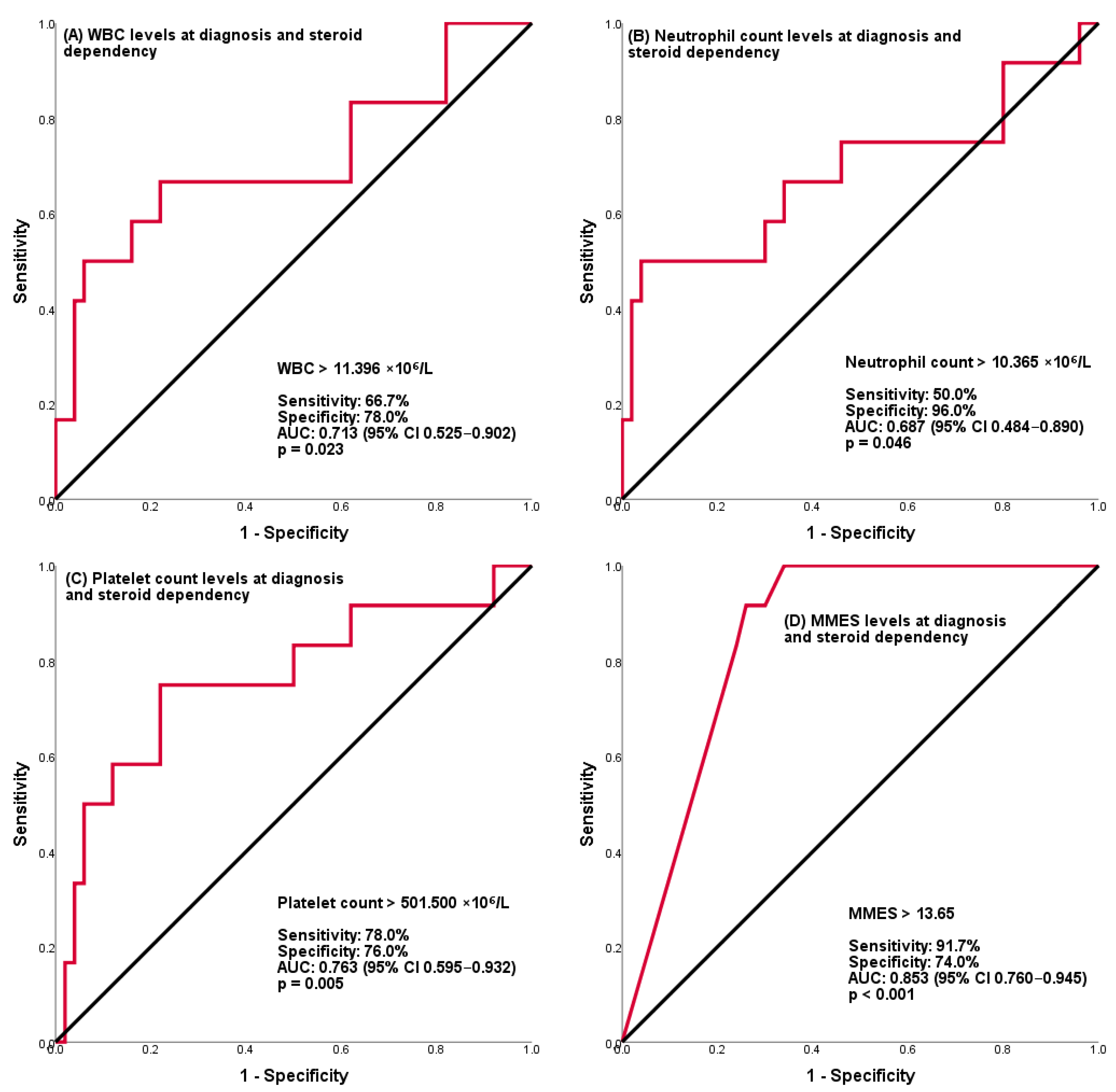6/L showed AUC: 0.68, 50% sens., and 96% spec. and was found to be significant in predicting steroid dependence. In a recent study by Aziz et al. involving 580 pediatric ulcerative colitis patients, the neutrophil/lymphocyte ratio and elevated WBC were found to be associated with endoscopic activity severity [