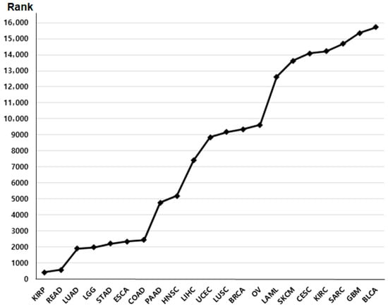 We retrieved primary datasets from The Cancer Genome Atlas (TCGA) portal “http://cancergenome.nih.gov/, accessed on 10 June 2025”. Normalized RNA sequencing (RNA-seq) expression data (TPM values) and corresponding clinical information were obtained from the TCGA-COAD and TCGA-READ cohorts. This database provides p-value rankings indicating the prognostic significance of BRIP1 expression across multiple cancer types (Figure 1). Among these cancers, colon and rectal cancers exhibited the most significant associations; therefore, these two cancer types were selected for further in-depth analysis. A total of 440 patients with colon cancer (TCGA-COAD) and 158 patients with rectal cancer (TCGA-READ) were included in the clinical correlation and survival analyses. BRIP1 expression values were log2-transformed for analysis, and patients were stratified into high- and low-expression groups based on the median BRIP1 expression level. Overall survival was defined as the time interval between the date of surgery and the date of death.
