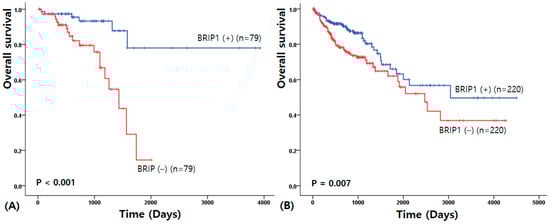 To identify the clinicopathological significance of BRIP1, patients were stratified into high- and low-expression groups based on the median BRIP1 expression value. The clinicopathological characteristics associated with BRIP1 mRNA expression in CRC patient tissues are summarized in Table 3. Higher BRIP1 expression was significantly associated with lower carcinoembryonic antigen (CEA) levels (57.1% vs. 42.2%, p = 0.028), whereas no other clinicopathological variables showed statistically significant associations.