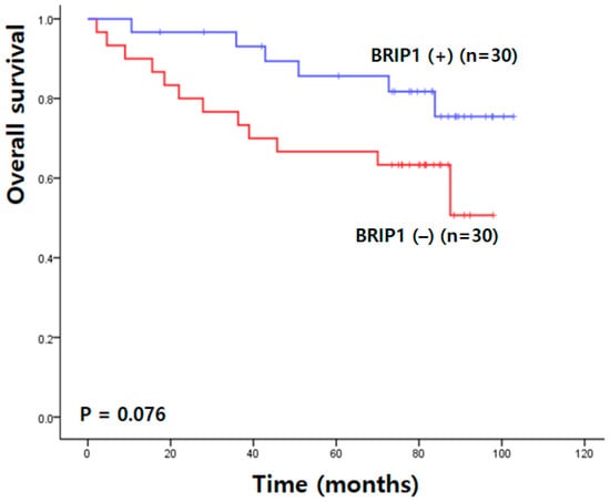 Kaplan–Meier survival analysis demonstrated that patients with higher BRIP1 expression tended to have improved overall survival compared with those with lower expression; however, this difference did not reach statistical significance (90.80 ± 4.65 vs. 70.40 ± 6.58 months; χ2 = 3.14; p = 0.076) (Figure 3).