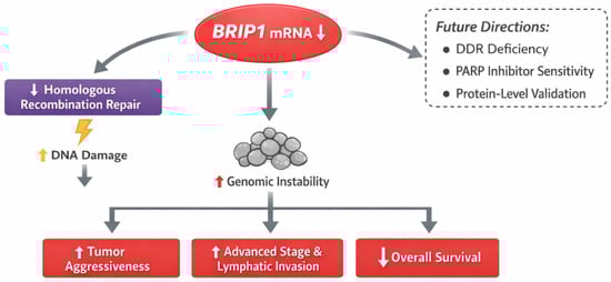 Finally, future investigations integrating genomic alterations, MSI status, proteomic profiles, and therapeutic response data may clarify whether BRIP1 serves as a surrogate marker of DDR deficiency and a potential predictor of response to DNA damage-targeted therapies, such as PARP inhibitors (Figure 4). Such integrative approaches may ultimately establish BRIP1 as a clinically actionable biomarker in colorectal cancer.