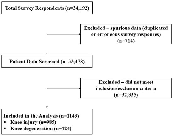 The participants answered specific questions (Figure S1) regarding their experiences with HWDS, specifically related to effects on function/ADL, pain, medication usage, work, sleep, prior treatments, and device satisfaction, obtained using a previously published questionnaire [13,14,15]. Additionally, gender, age (when injured), pain duration, and specifics of device use were queried. The survey instrument, while proprietary, included several validated PROMs, like Numeric Rating Scale (NRS) pain measures, and single-item questions derived from general (not knee-specific) function outcome instruments, including the Oswestry Disability Index. Many patients completed several survey questionnaires during their treatment, so to avoid duplication and provide consistency, only the final completed survey per participant was analyzed. Also, missing or repeated survey responses were excluded from the data analysis.
