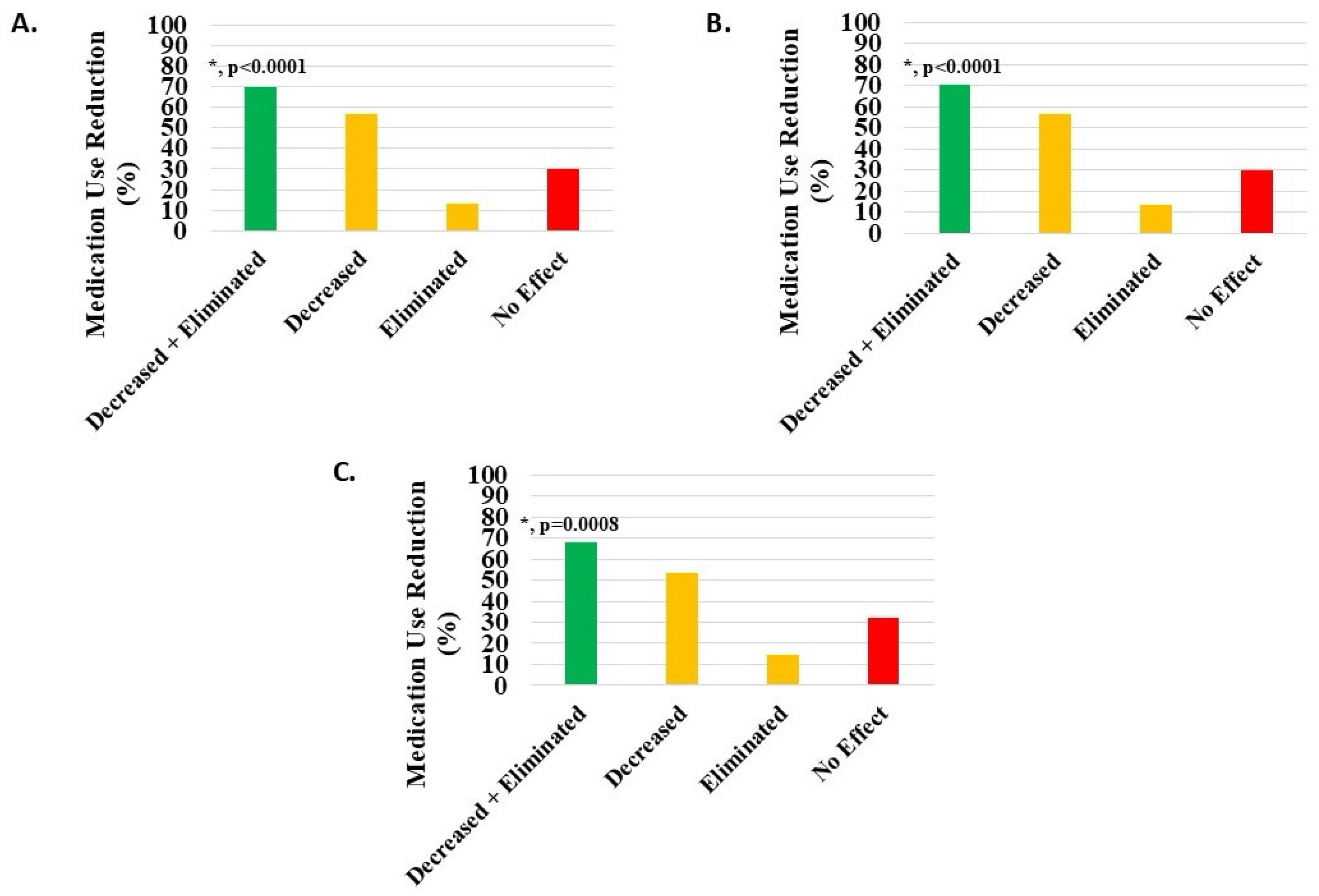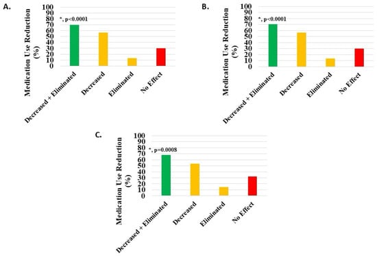 Decrease or elimination in use of pain medications post-treatment with H-Wave® device stimulation for (A) all knee disorders, (B) knee injury, and (C) knee degeneration. Decreased + eliminated versus no effect was statistically significant for all groups (*, p < 0.0001, p < 0.0001, and p = 0.0008, respectively).