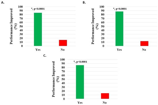 Of 1083 knee subjects (excluding 60 with missing data), 634 (58.54%) were off work when starting H-Wave®, while 235 (21.70%) performed modified work, and 214 (19.76%) were in full-time work. Of the 634 subjects off work, 339 related this to their injury, and of these, 143 (42.18%) indicated that H-Wave® had assisted their return to work. Data analysis from those not working suggested that the larger the difference between reported pain levels before and after HWDS, the more likely HWDS was to help them return to work (p < 0.0001, 95% confidence interval: 0.274, 0.607). Of 423 subjects (excluding 26 with missing survey data) performing full or modified work, 358 (84.63%) reported statistically significant (p < 0.0001) improvement in performance at work following treatment with H-Wave® (Figure 7A, Table 2). Additional analysis suggested that H-Wave® is more likely to improve performance at work for those whose pain was reduced by at least 20% after treatment (odds ratio = 25.215; 95% confidence interval: 11.461, 57.888).