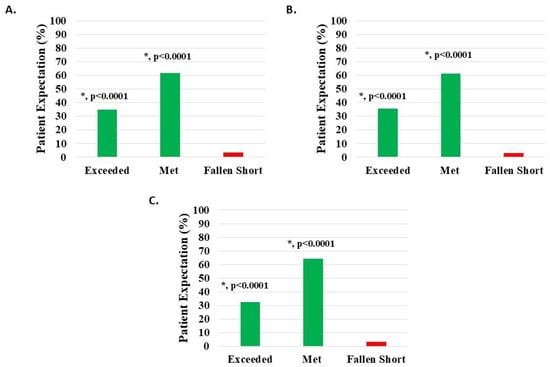 Level of patient expectations, where the proportion reporting H-Wave® device stimulation either exceeded or met expectations, was statistically significant (*, p < 0.0001) for all groups analyzed: (A) all knee disorders, (B) knee injury, and (C) knee degeneration.