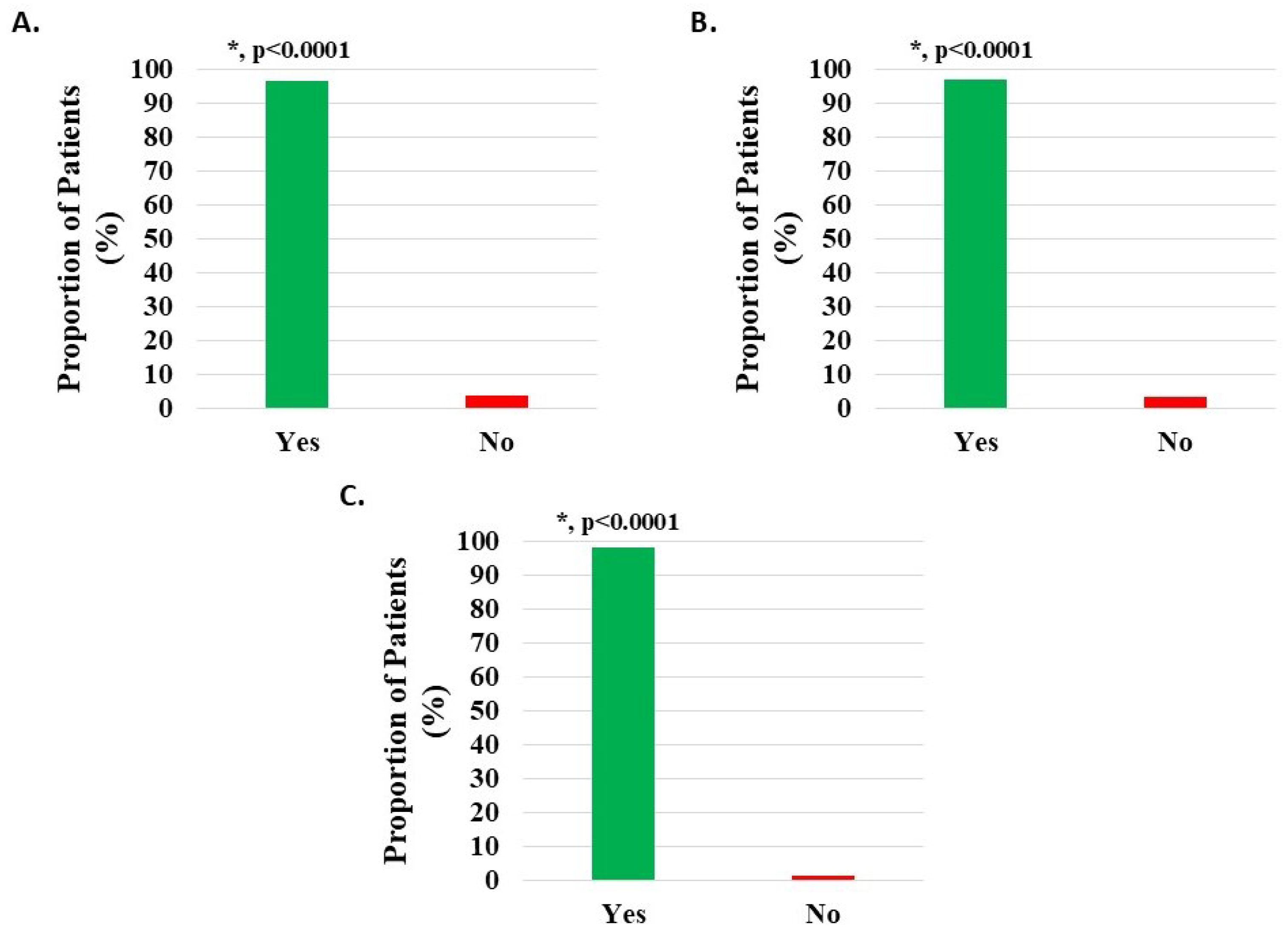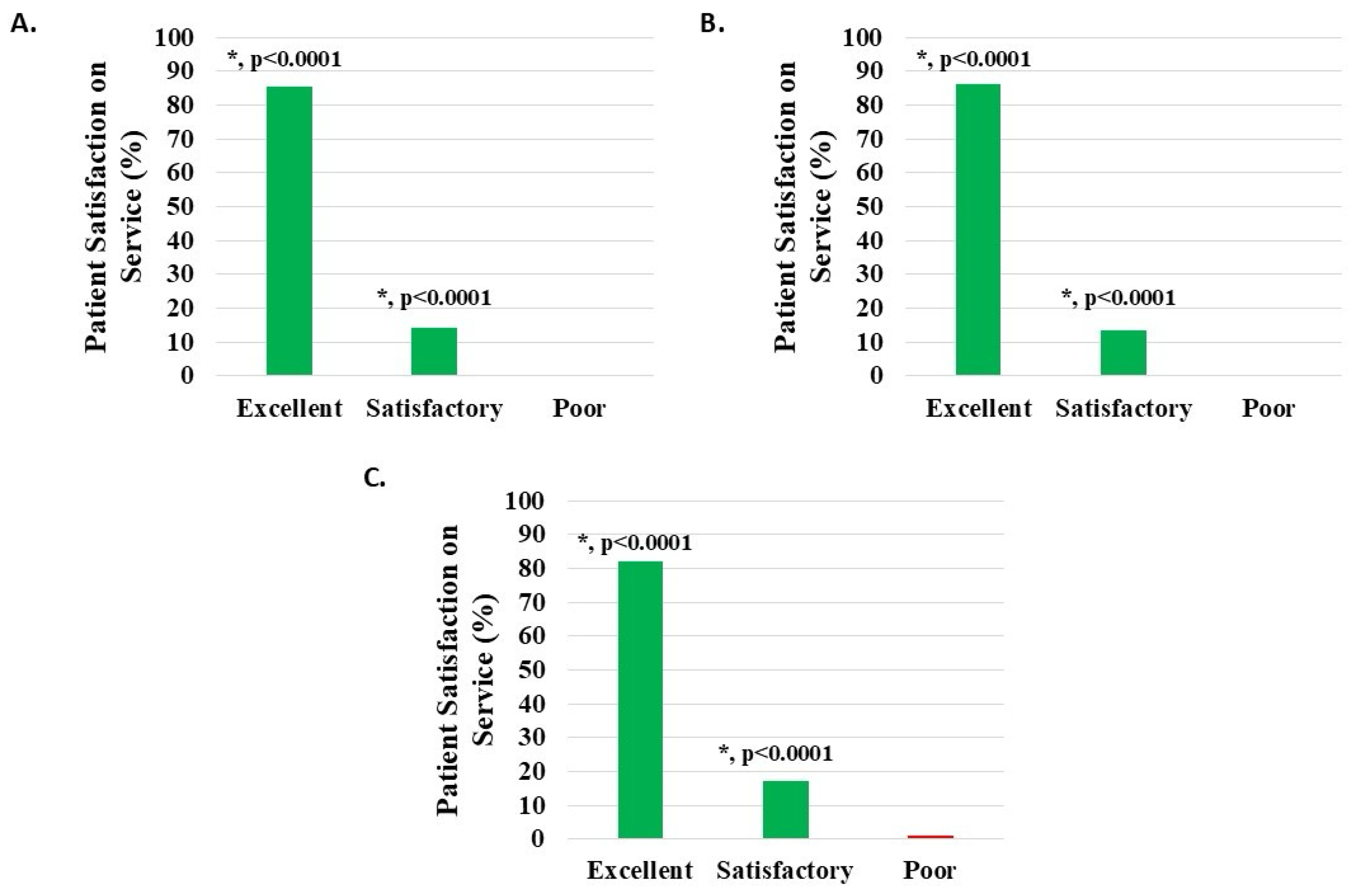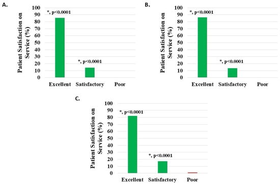 Level of patient satisfaction with service, where the proportion reporting H-Wave® device stimulation instruction to be excellent or satisfactory was statistically significant (*, p < 0.0001), for all groups analyzed: (A) all knee disorders, (B) knee injury, and (C) knee degeneration.