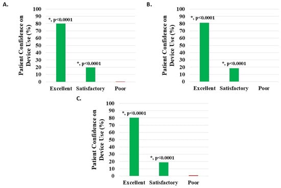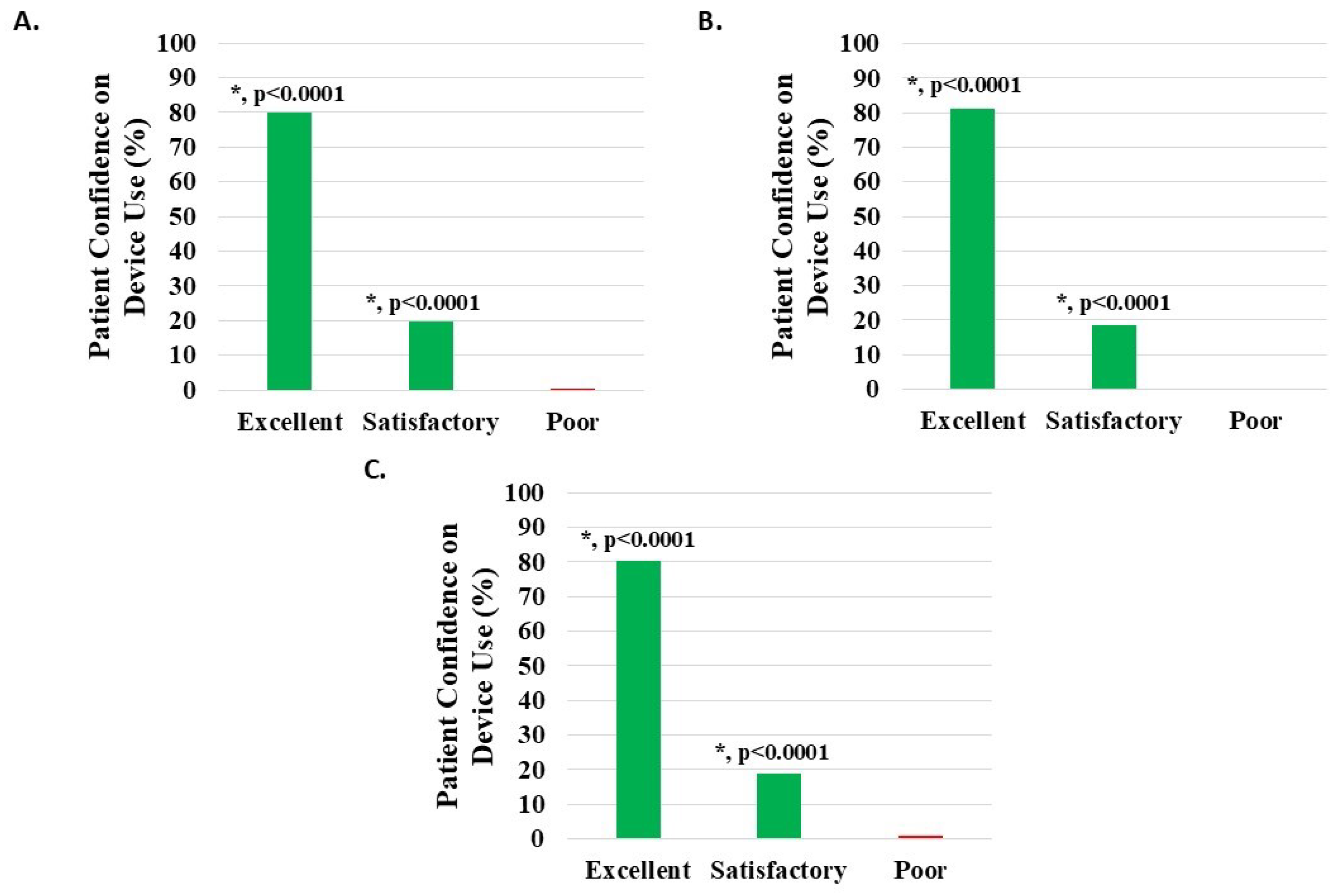 Level of patient confidence in device use, where the proportion reporting H-Wave® device stimulation use on their own being excellent or satisfactory was statistically significant (*, p < 0.0001) for all groups analyzed: (A) all knee disorders, (B) knee injury, and (C) knee degeneration.