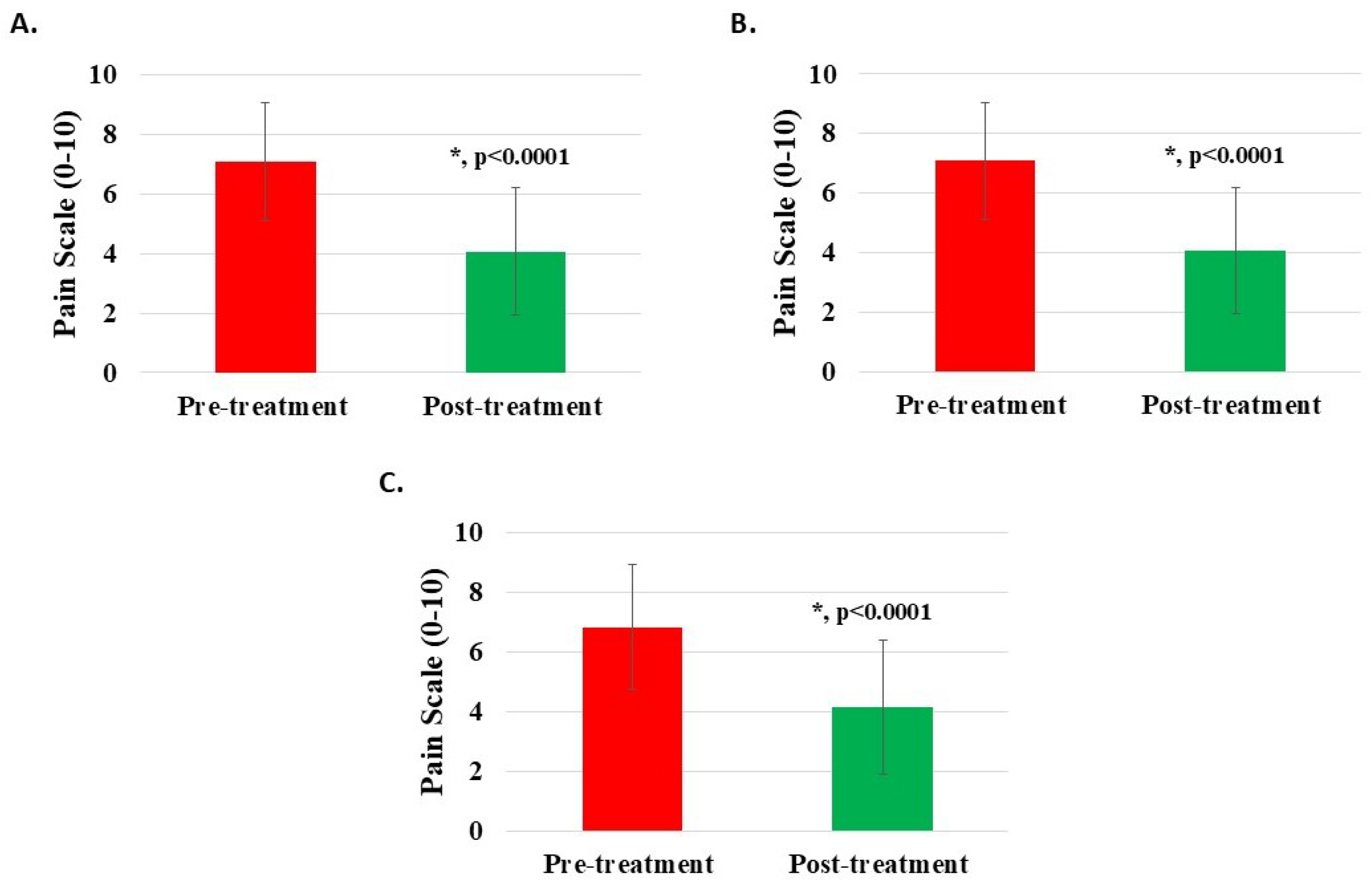 Pain reduction post-treatment with H-Wave® device stimulation for (A) all knee disorders, (B) knee injury, and (C) knee degeneration. A difference of 2 or more points was statistically significant for all groups (*, p < 0.0001).