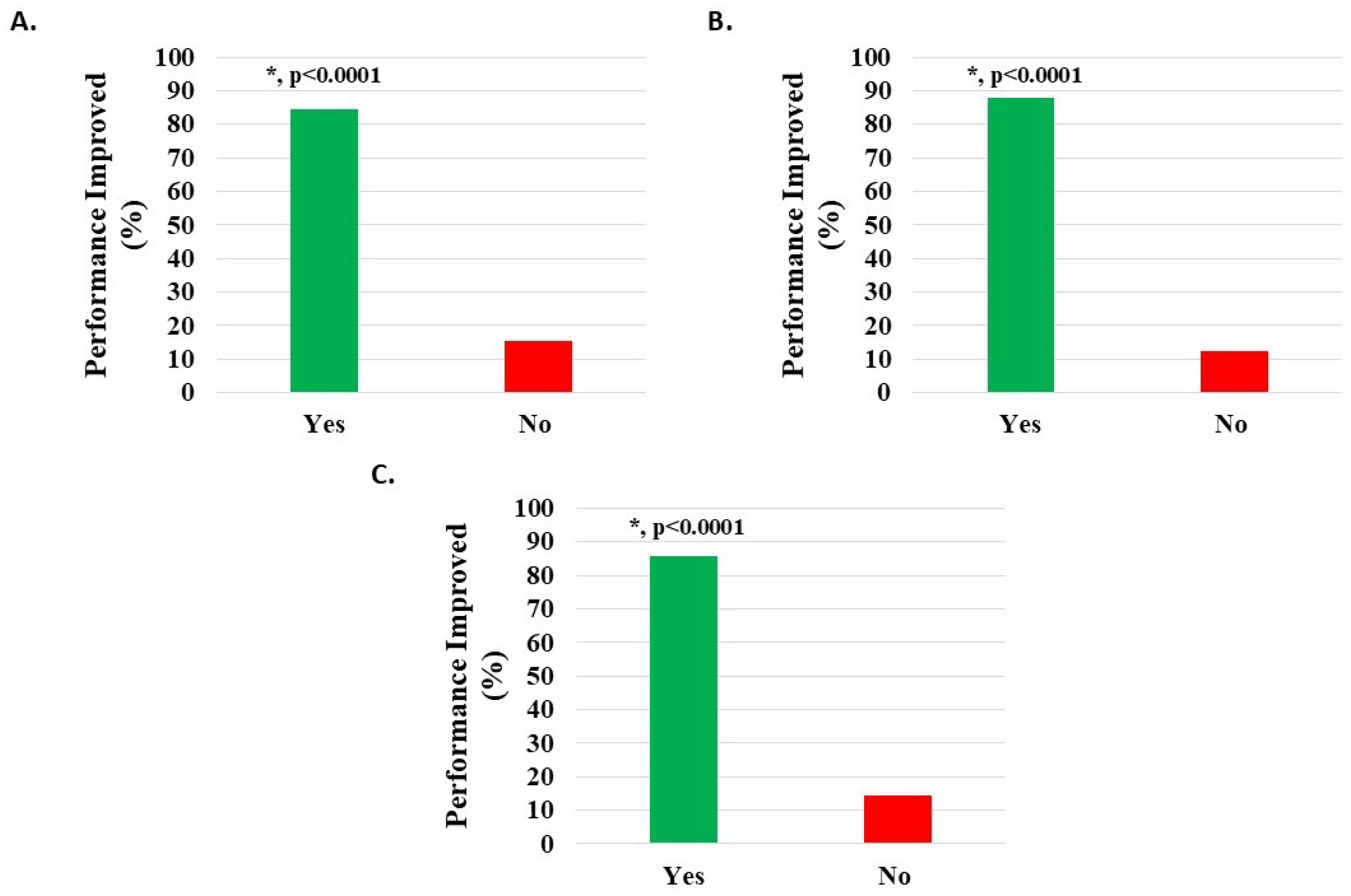 Improvement in function/ADL post-treatment with H-Wave® device stimulation for (A) all knee disorders, (B) knee injury, and (C) knee degeneration. The improvement was statistically significant for all groups (*, p < 0.0001).