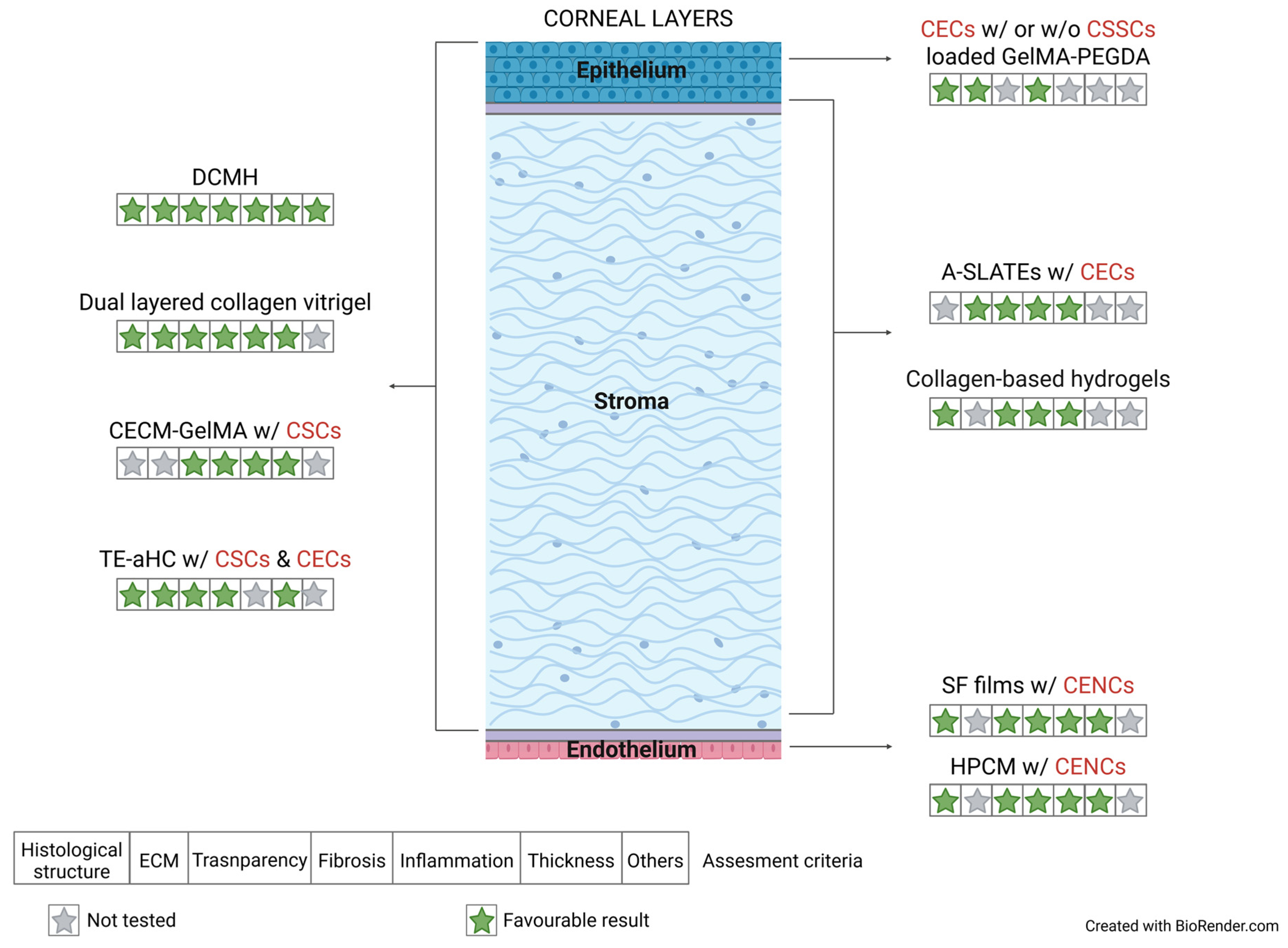 | EPITHELIUM and STROMA | Nie X et al., 2024 [54] | rhEGF/TSA-loaded bilayer graft | ✓ | Concentrated aqueous solutions of Gel/Alg-CDH. | ✗ | ✗ | NA | ✓ |