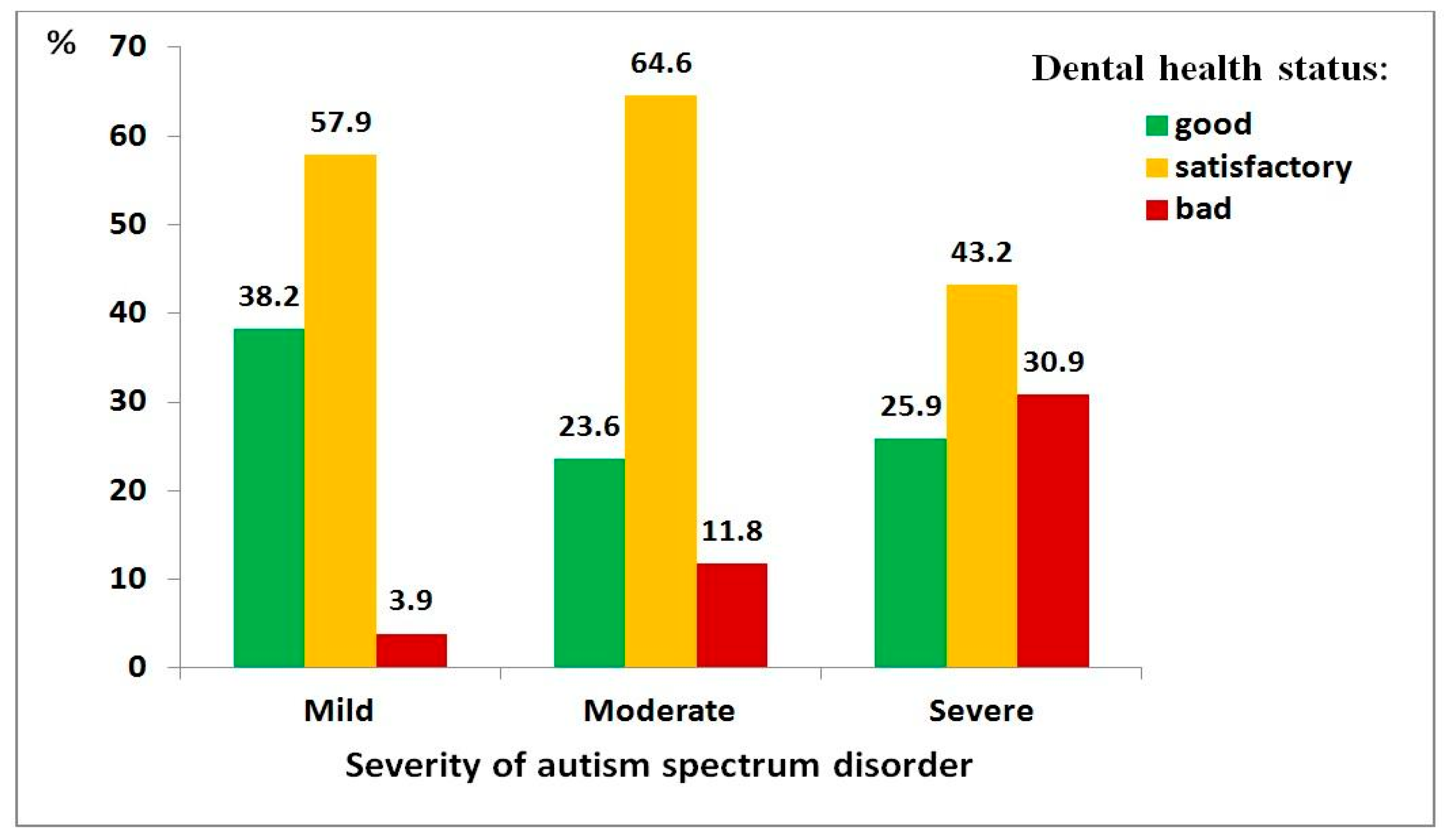 Regarding ASD severity (Figure 1), greater disorder severity was associated with worse dental health (χ2 = 37.74, df = 4, p < 0.001; ρ = 0.213, p < 0.001). Children with severe ASD were substantially more likely to have poor dental health compared to those with mild ASD (OR = 12.7, 95% CI: 3.6–44.4).