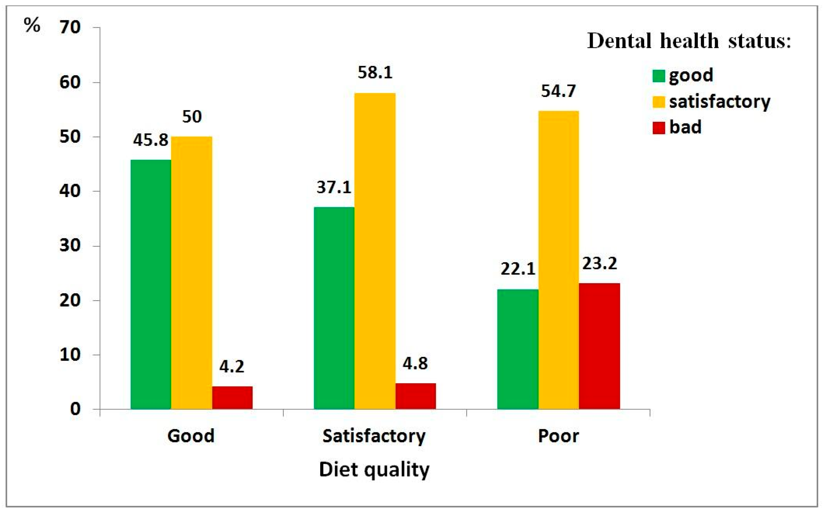 Regarding diet quality (Figure 2), children with a poor-quality diet showed significantly higher odds of poor dental health (χ2 = 26.69, df = 4, p < 0.001; ρ = 0.246, p < 0.001), with an 11-fold increase in risk compared to those with a good-quality diet (95% CI: 2.5–48.6).