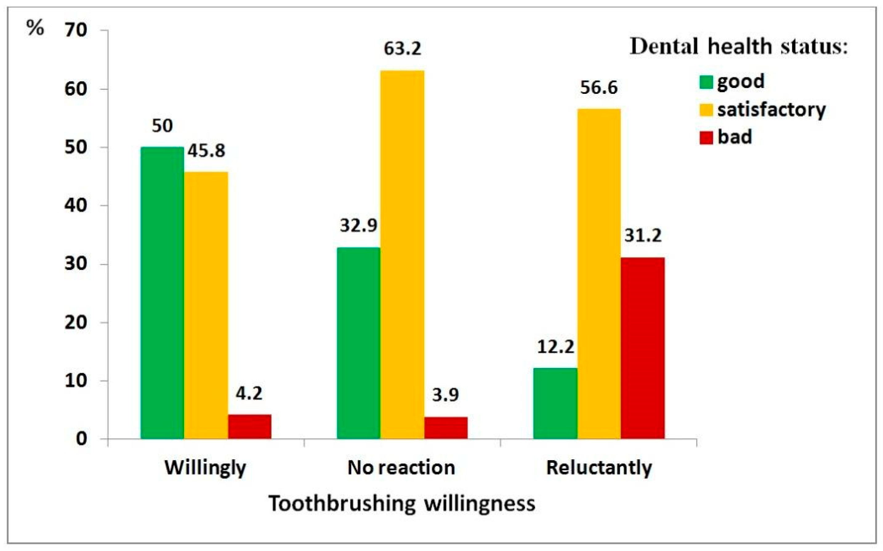 Regarding toothbrushing willingness (Figure 3), the association was particularly strong (χ2 = 83.66, df = 4, p < 0.001; ρ = 0.435, p < 0.001). Children unwilling to brush their teeth had 30 times higher odds of poor dental health than those who were willing (95% CI: 10.8–83.2).