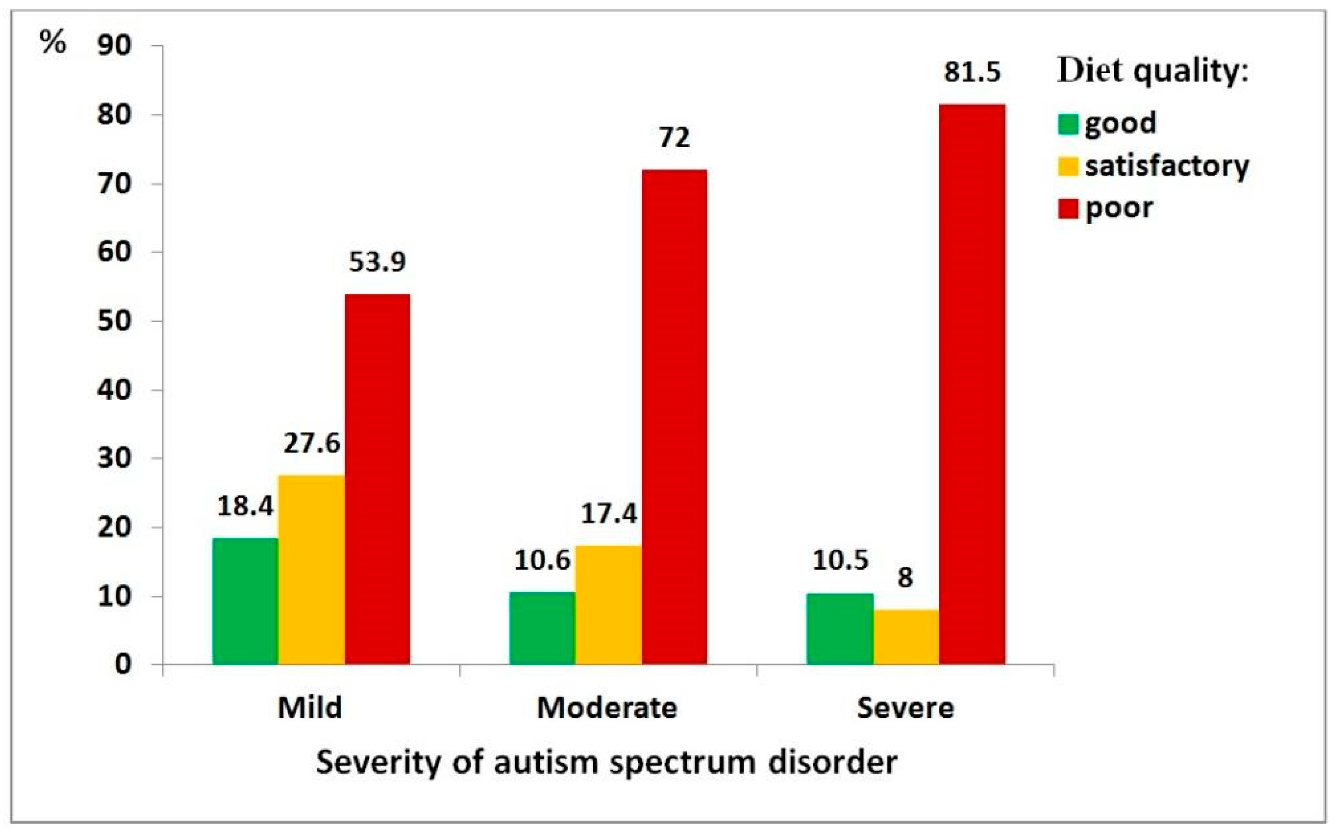 Figure 4 shows the relationship between ASD severity and diet quality, demonstrating that greater disorder severity is associated with poorer diet quality—an effect that was statistically significant (χ2 = 22.00, df = 4, p < 0.001; ρ = 0.176, p < 0.001). It can be illustrated with the following example: children with severe ASD had a significantly higher risk of poor diet quality compared to those with mild ASD (OR = 2.53, 95% CI: 1.15–5.55).