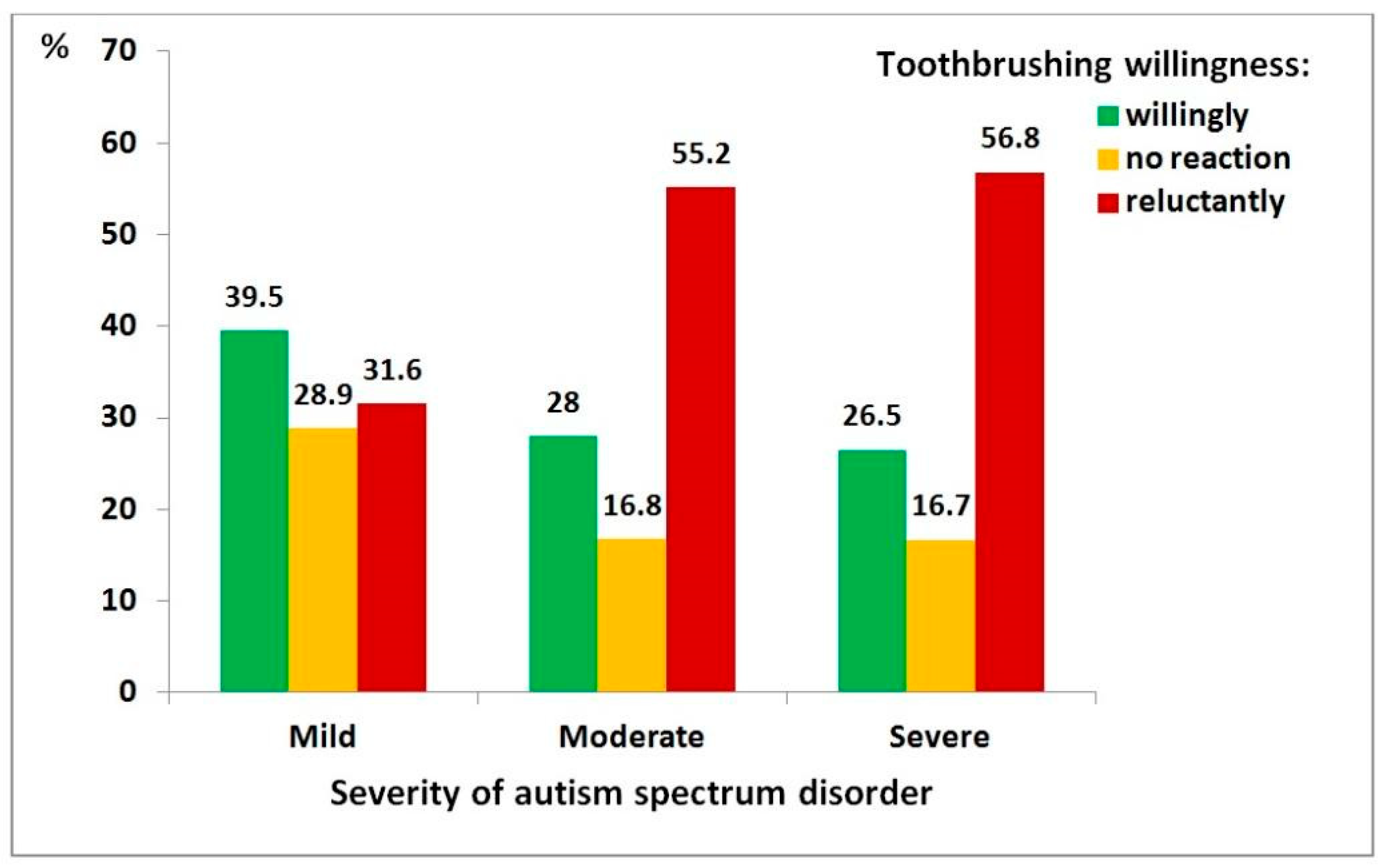 ASD-related behavioral factors, such as sensory sensitivities or cognitive limitations, can make it difficult to develop good brushing habits, which eventually leads to poor oral hygiene. It was found that children with ASD used toothpaste and brushed their teeth less frequently and depended more on parental help [14].