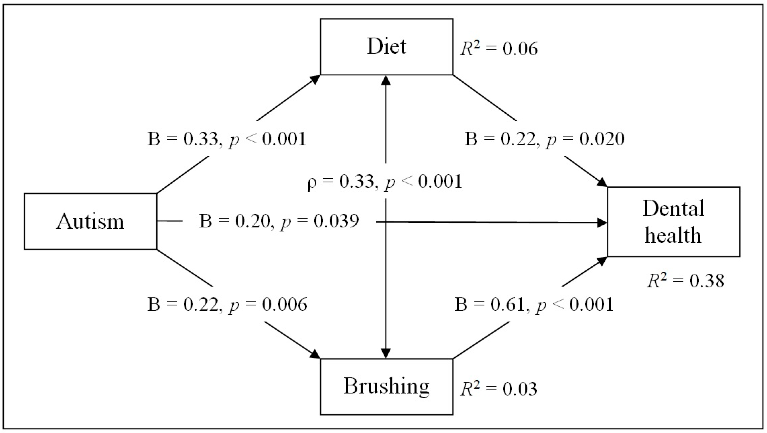 From the regression of dental health status on ASD severity, the direct effect, as mentioned above, was as follows: unstandardized B = 0.199 (p = 0.039), standardized (std) β = 0.117. According to the path model, autism influences dental health through two paths: diet and toothbrushing behaviors. Then, for the first path, the indirect effect = 0.325 × 0.216 ≈ 0.070 (std: 0.235 × 0.175 ≈ 0.041), and for the second path, the indirect effect = 0.223 × 0.613 ≈ 0.137 (std: 0.174 × 0.490 ≈ 0.080). The total indirect effect is as follows: unstandardized 0.070 + 0.137 ≈ 0.207, std 0.041 + 0.080 ≈ 0.121. Overall, autism has a significant total (direct and indirect) effect on dental health (0.406; std: 0.238).