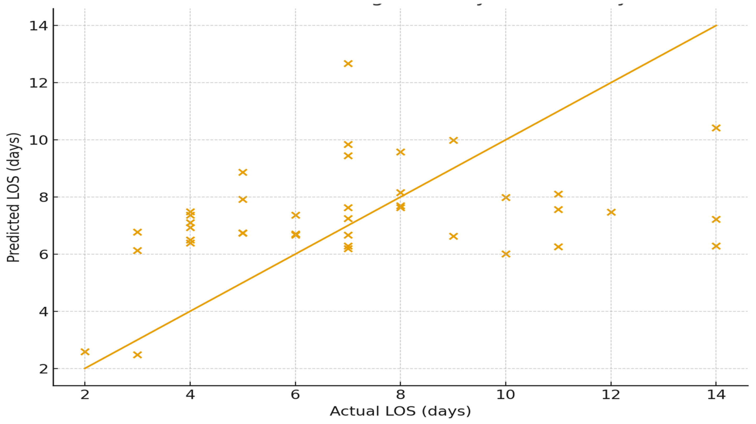 Figure 1). The clustering of observations around the identity line, particularly within the 5–10-day range—which represents the most common LOS interval in the cohort—demonstrates that the Random Forest model provides reasonably strong predictive performance for typical cases. Greater dispersion is visible at higher LOS values, indicating increasing prediction difficulty for more complex or prolonged hospitalizations, a trend consistent with the model’s R