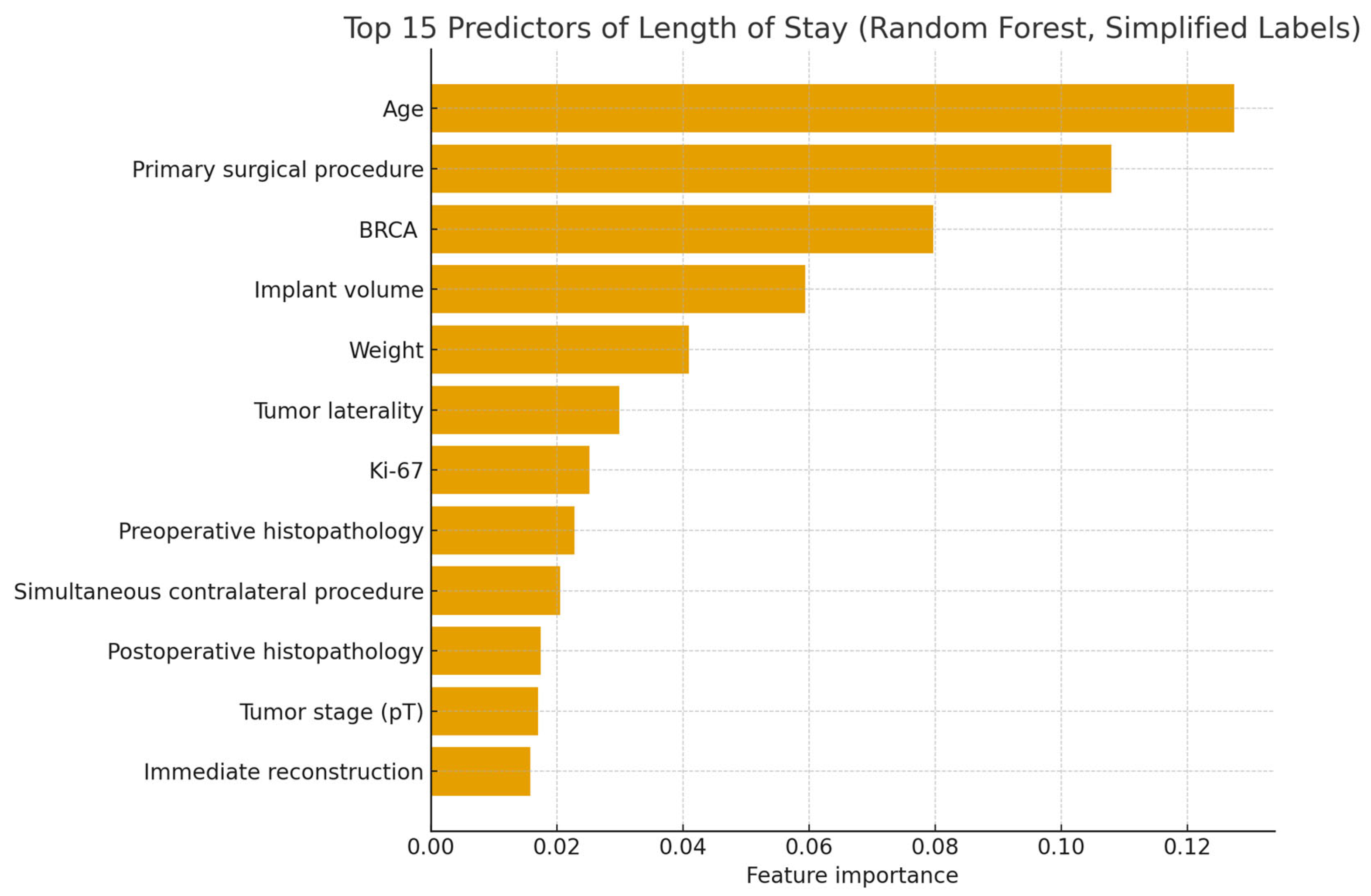 Feature importance analysis from the best-performing regression model, the Random Forest regressor, demonstrated that both patient-related and surgery-related variables substantially contributed to LOS prediction. Age emerged as the single most influential predictor, suggesting a strong relationship between patient age and recovery trajectory after surgery. Several surgical variables were also highly impactful, particularly those reflecting the type and complexity of the primary procedure. These included distinctions between breast-conserving surgery and mastectomy, the presence of bilateral submuscular implants, and combined reconstructive approaches incorporating both implants and latissimus dorsi flaps.