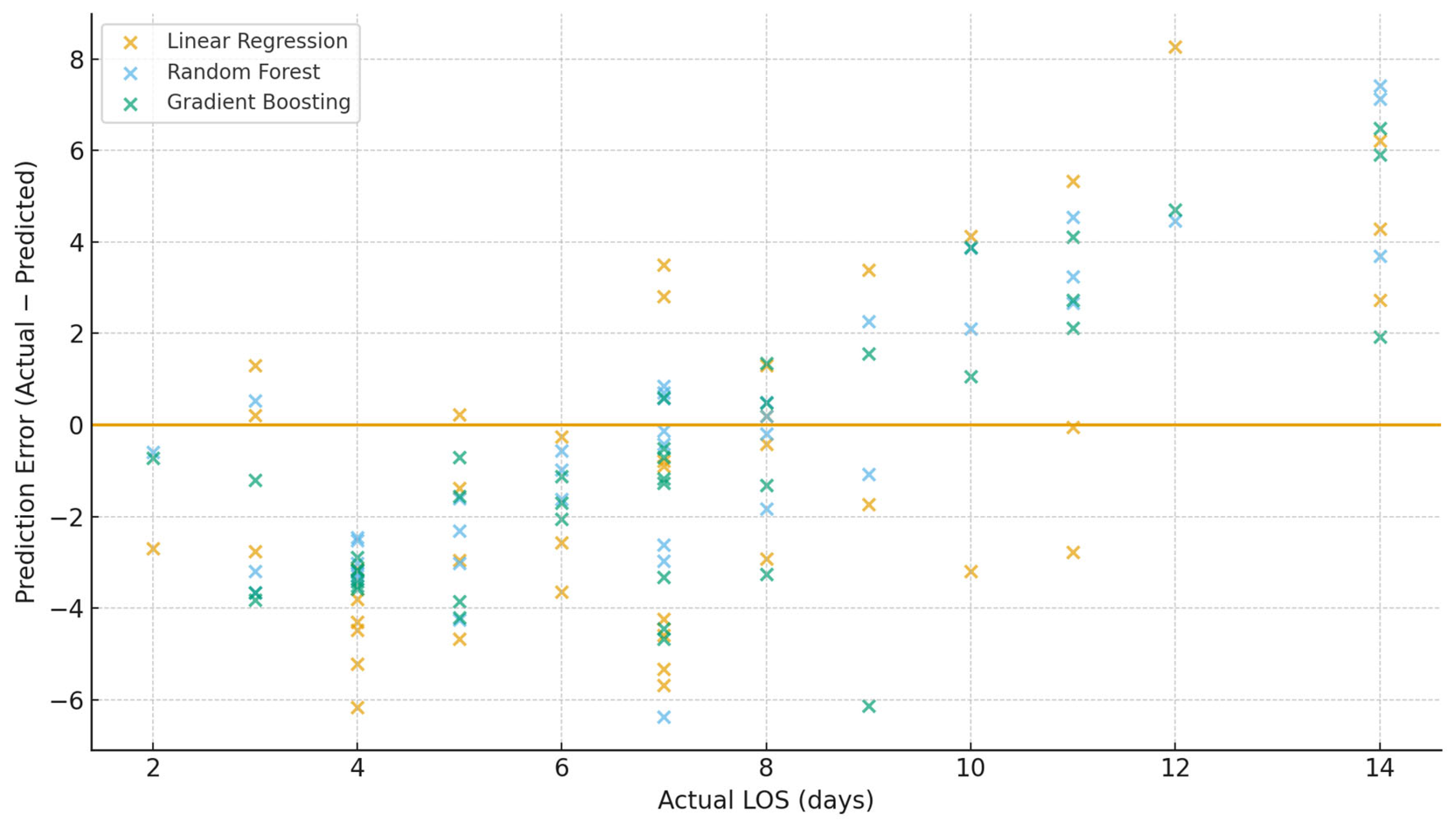 The above figure shows prediction errors (actual minus predicted length of stay) for three regression models—multiple linear regression, Random Forest regressor, and Gradient Boosting regressor. Each point represents a single patient in the test dataset. The horizontal line at zero denotes perfect prediction. Random Forest demonstrates the smallest dispersion of errors, consistent with its superior MAE, RMSE, and R2 values.