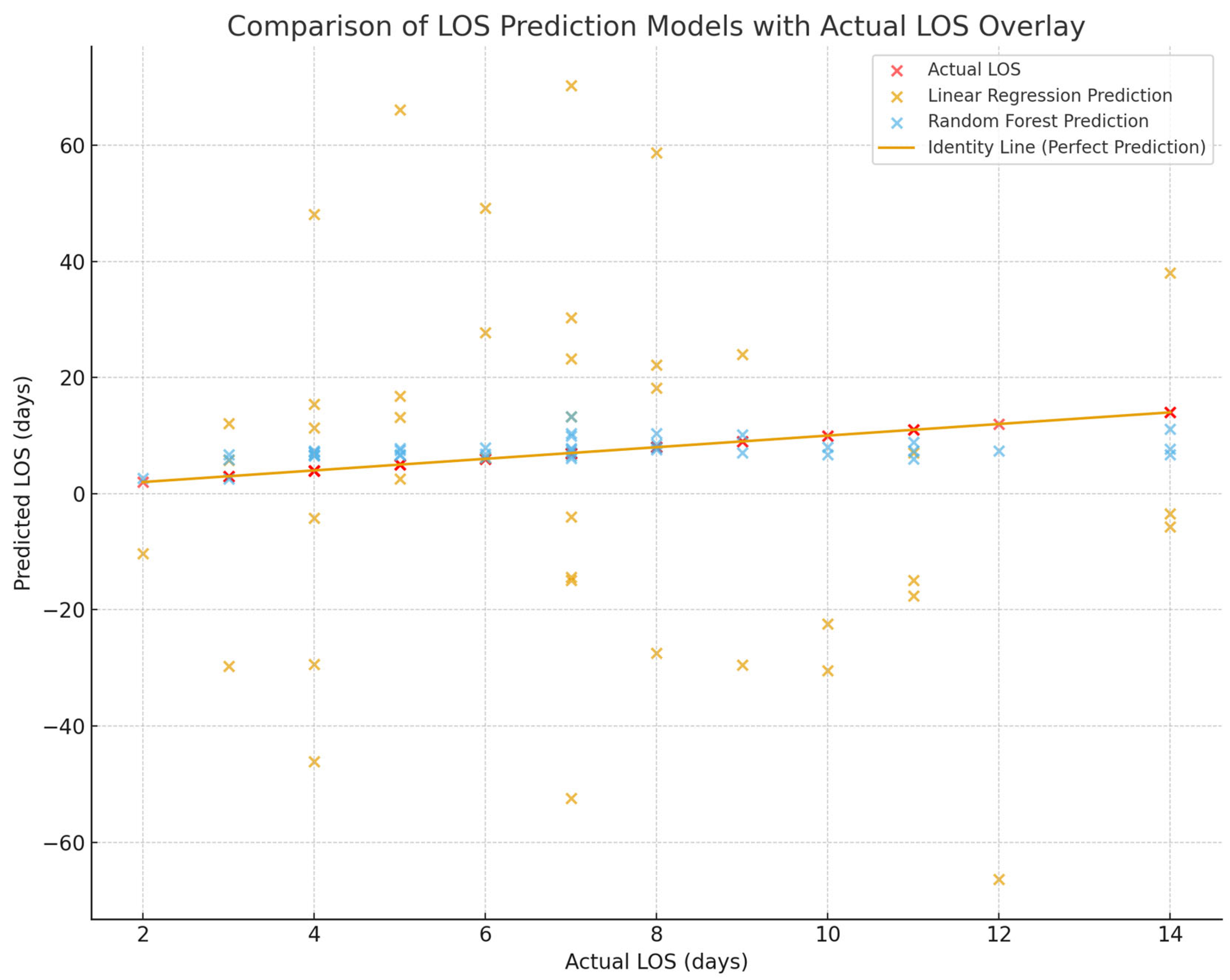 This scatter plot compares the performance of multiple linear regression and Random Forest regression models in predicting postoperative length of stay (LOS) following breast cancer surgery. Red points represent the actual LOS values derived from the institutional dataset and illustrate the real distribution of hospitalization duration in the cohort. Blue points correspond to predictions generated by the Random Forest model, while yellow points represent predictions from the multiple linear regression model. The diagonal identity line denotes perfect agreement between predicted and observed LOS.