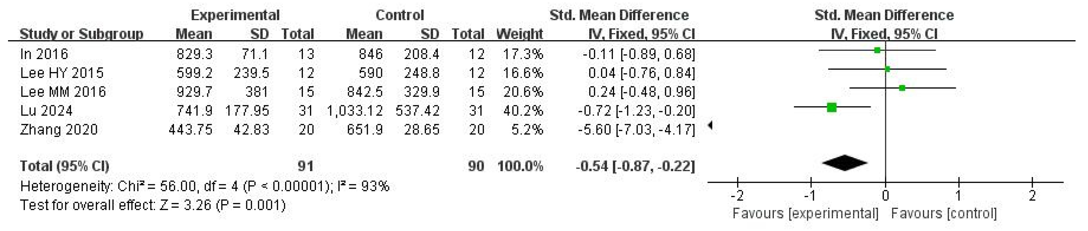 | Lee MM 2016 [53] | 5 | −0.82∼−0.09 | 0% | 0 | 3.14 | 0.02 |