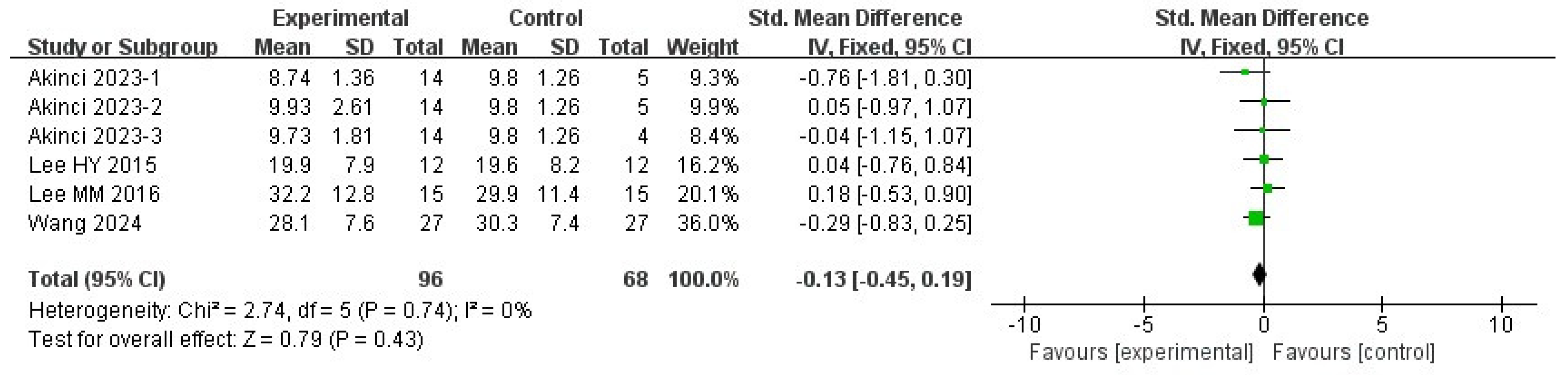 | Wang 2024 [34] | 5 | −0.65∼0.16 | 0% | 0 | 2.82 | 0.23 |