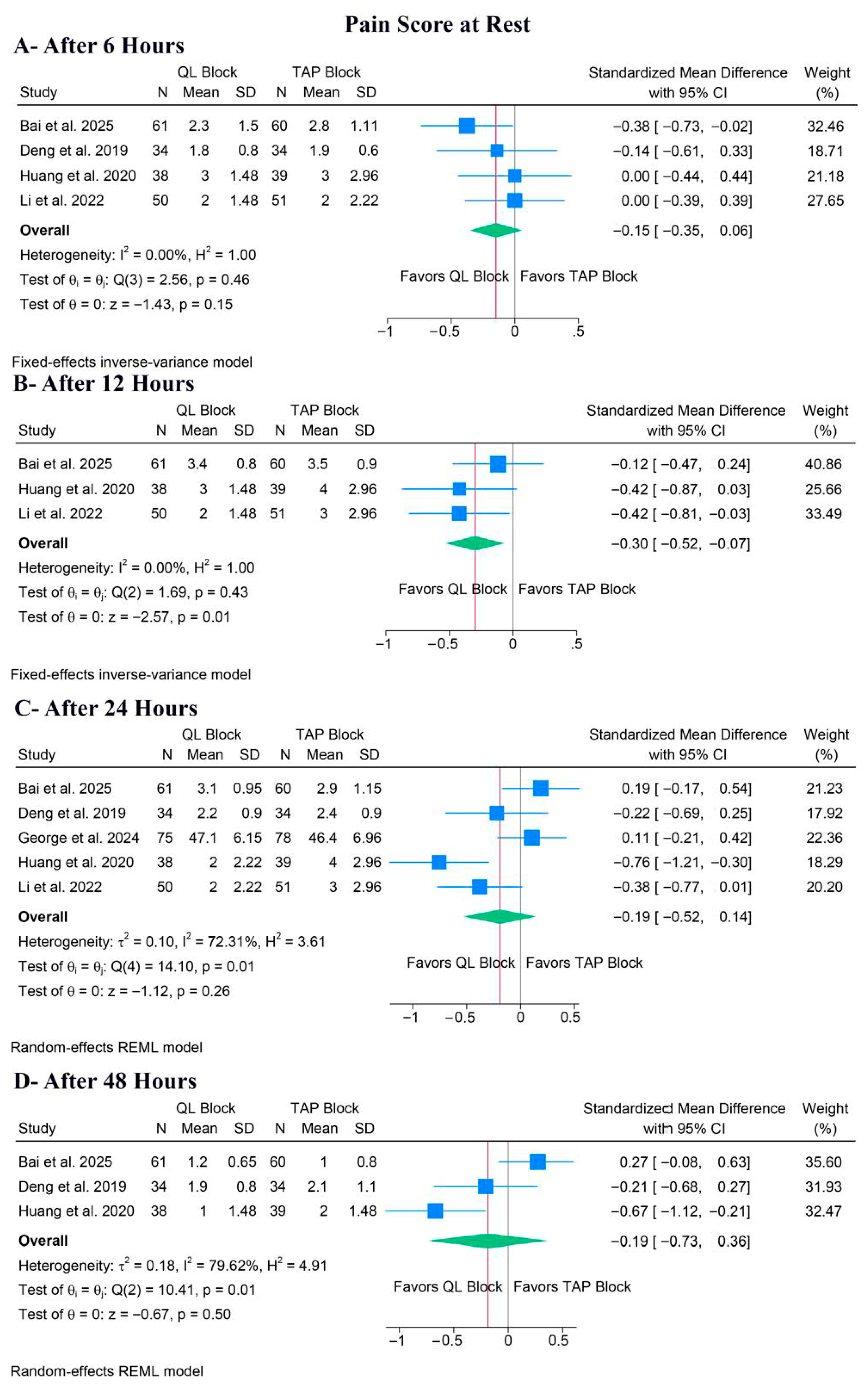 | Bai et al. 2025 [19] | RCT | China | 121 | Lateral QL block. 0.20 mL/side of 0.375% ropivacaine. | Bilateral TAP block. 0.20 mL/side of 0.375% ropivacaine. | Intraop: Remifentanil. Postop: IV sufentanil PCA, Flurbiprofen axetil (rescue). | Cumulative remifentanil administration during surgery. | VAS—0–10 | 18–80 years, ASA I-II, for elective laparoscopic radical resection (sigmoid or rectal). | 48 h |