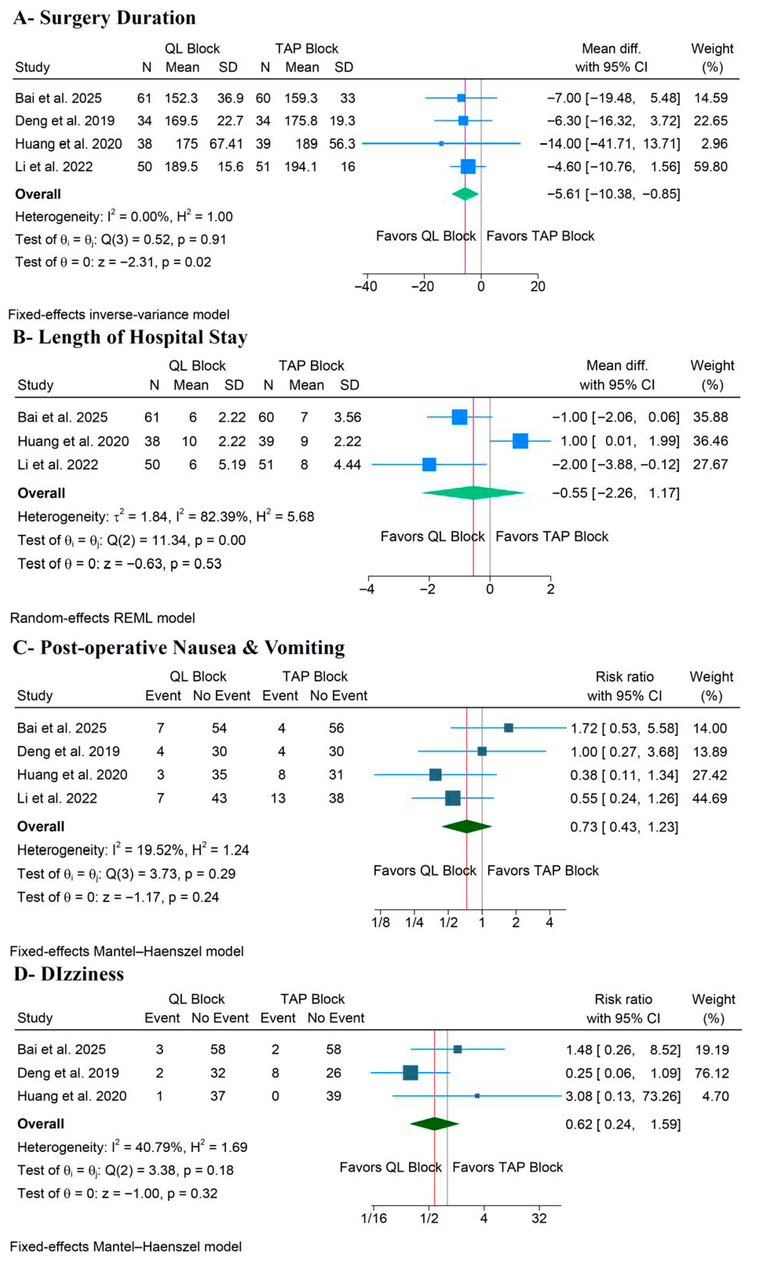 - Outcome data: pain scores at all reported time points, total opioid/analgesic consumption, LoS, surgery duration, and postoperative adverse events.