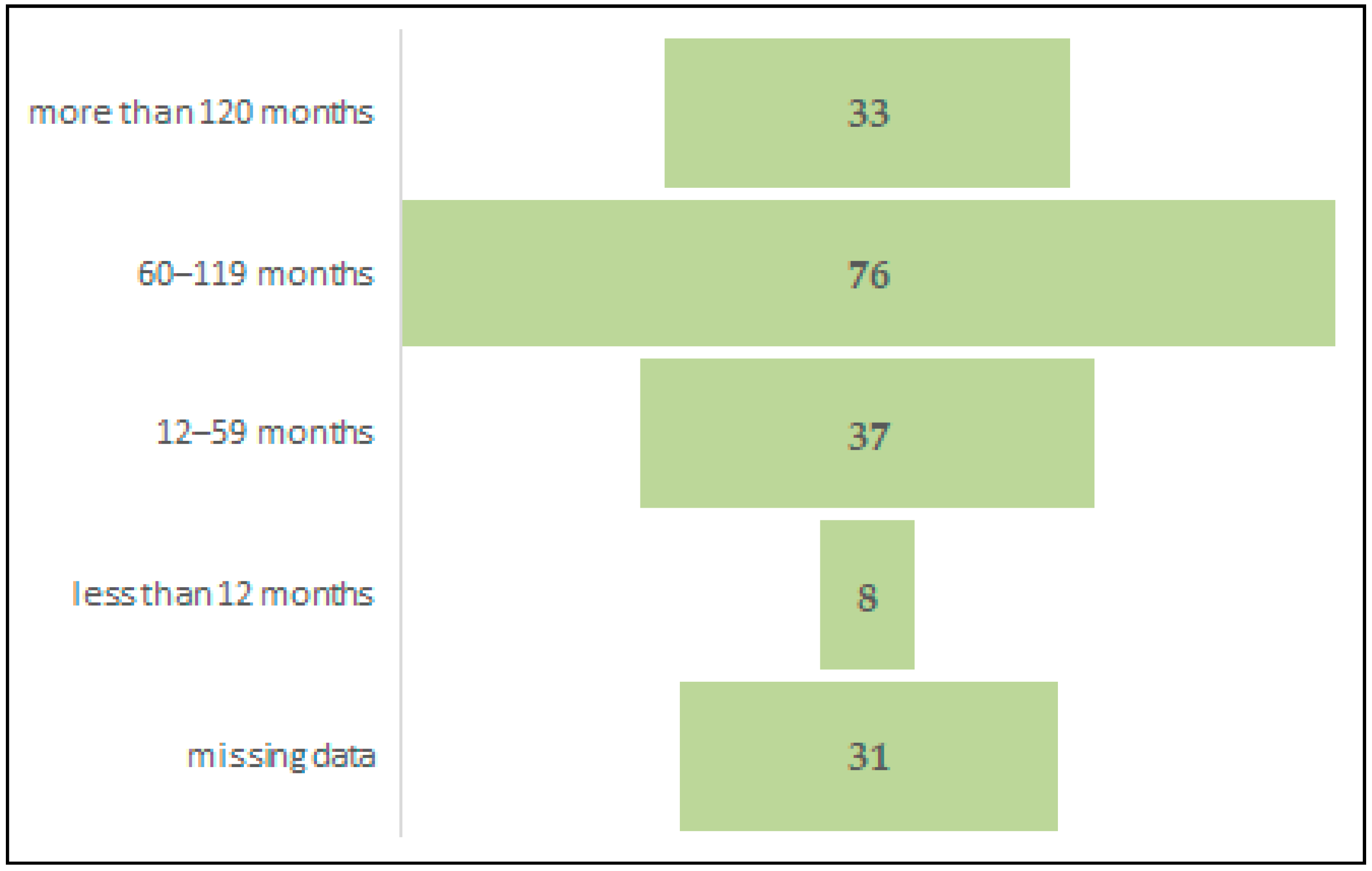 | >120 months | 8 (19.04%) | 24 (16.9%) | 1 (100%) | |