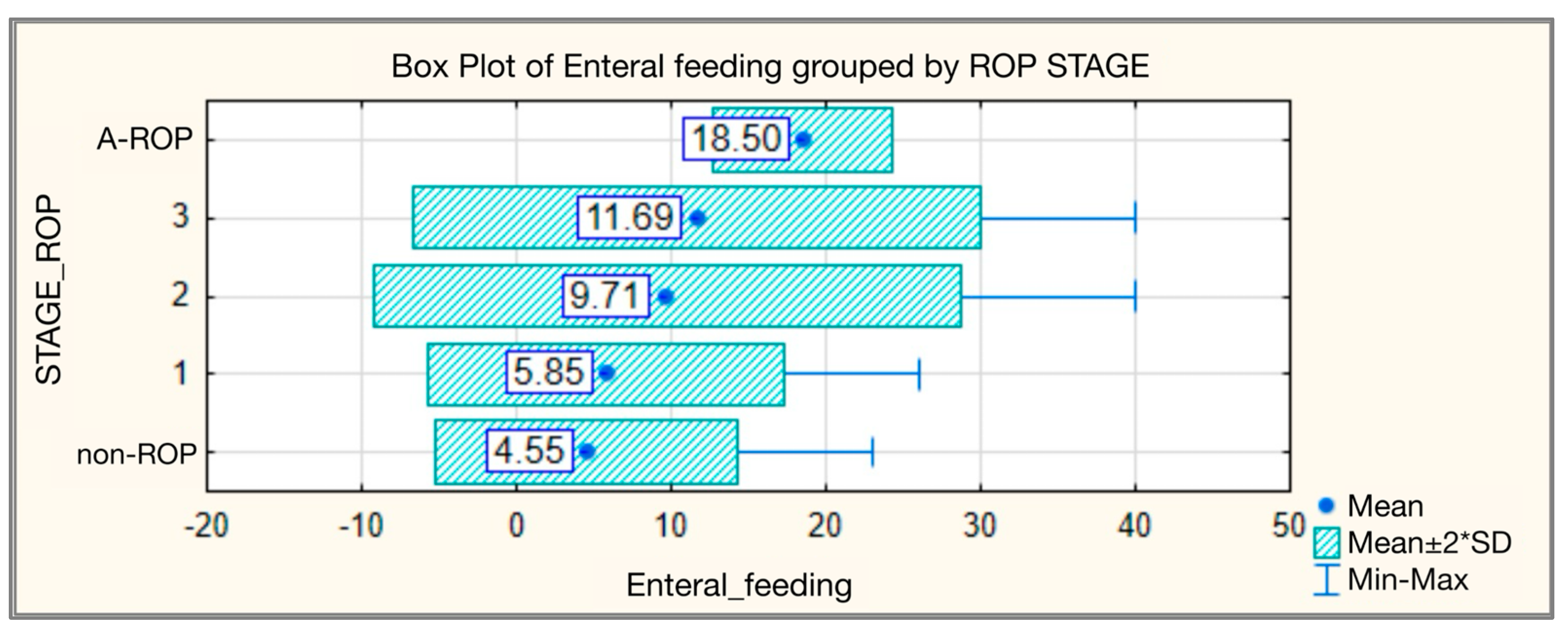 On average, enteral feeding was initiated considerably earlier in the non-ROP group, at 4.55 ± 4.863 days (median 3.00), compared with the stage 3 ROP group, where feeding began at 11.69 ± 9.185 days (median 12.00). In the A-ROP group, enteral nutrition was introduced even later, typically between days 16 and 21, with statistically significant differences observed across the groups (Table 3, Figure 3).