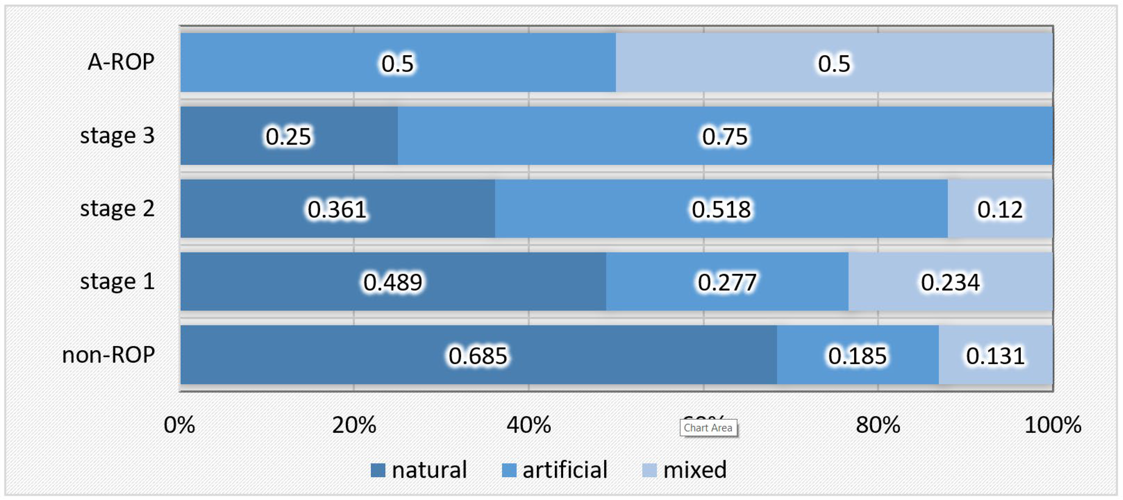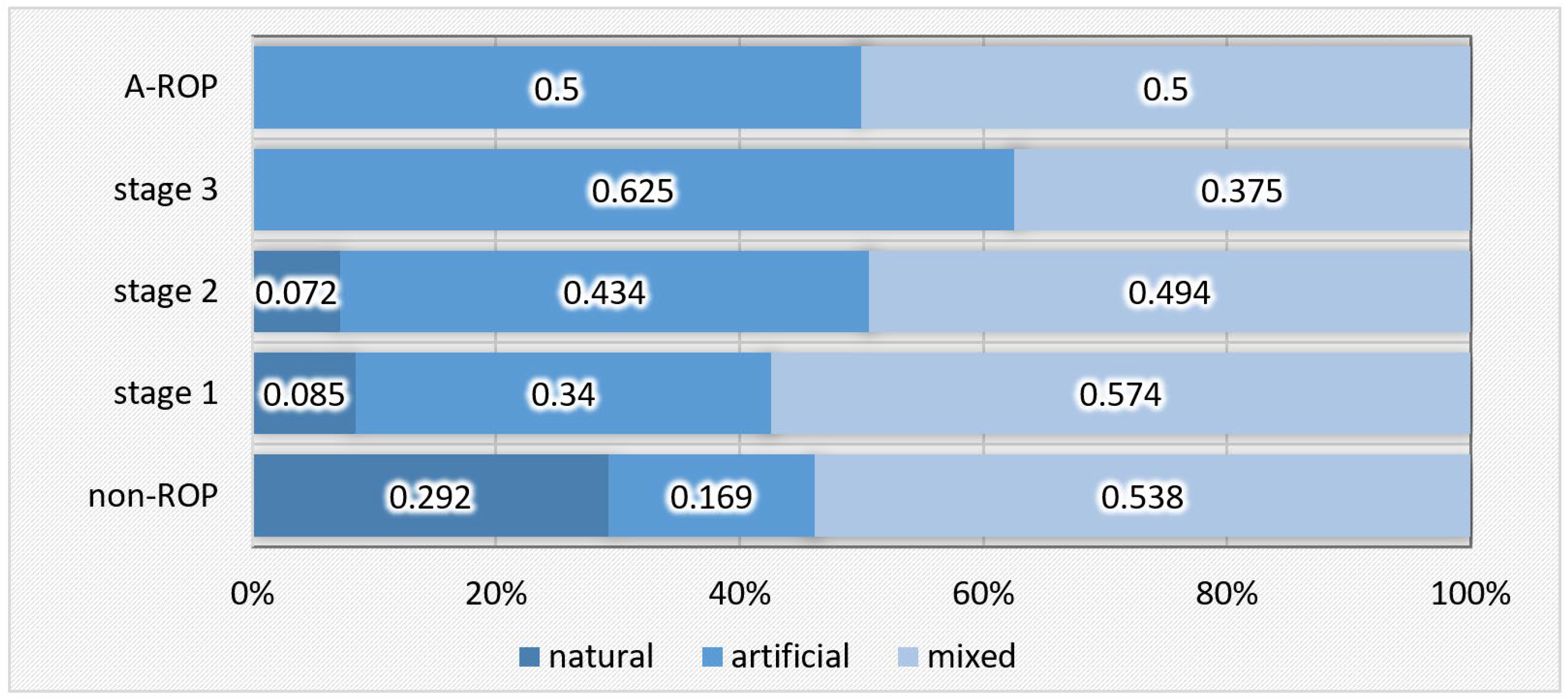 Statistically significant differences were also found in the type of feeding, both during hospitalization and at discharge. Natural feeding was present in nearly one-third of the newborns in the non-ROP group but was rare or absent in the ROP groups. In contrast, artificial feeding predominated in stage 3 ROP, while in stage 2 ROP and A-ROP, similar proportions of infants received artificial and mixed feeding (Table 5, Figure 5).