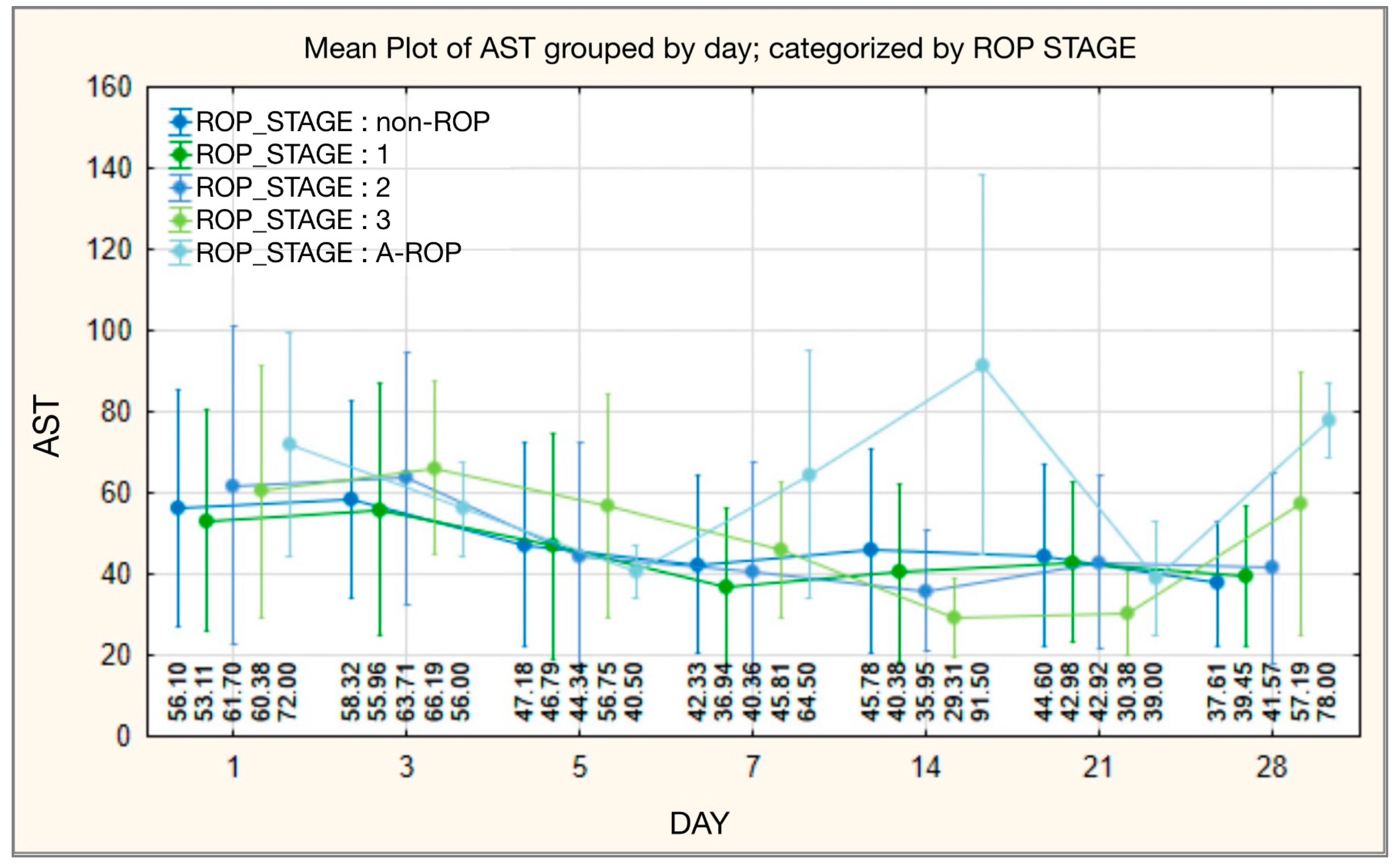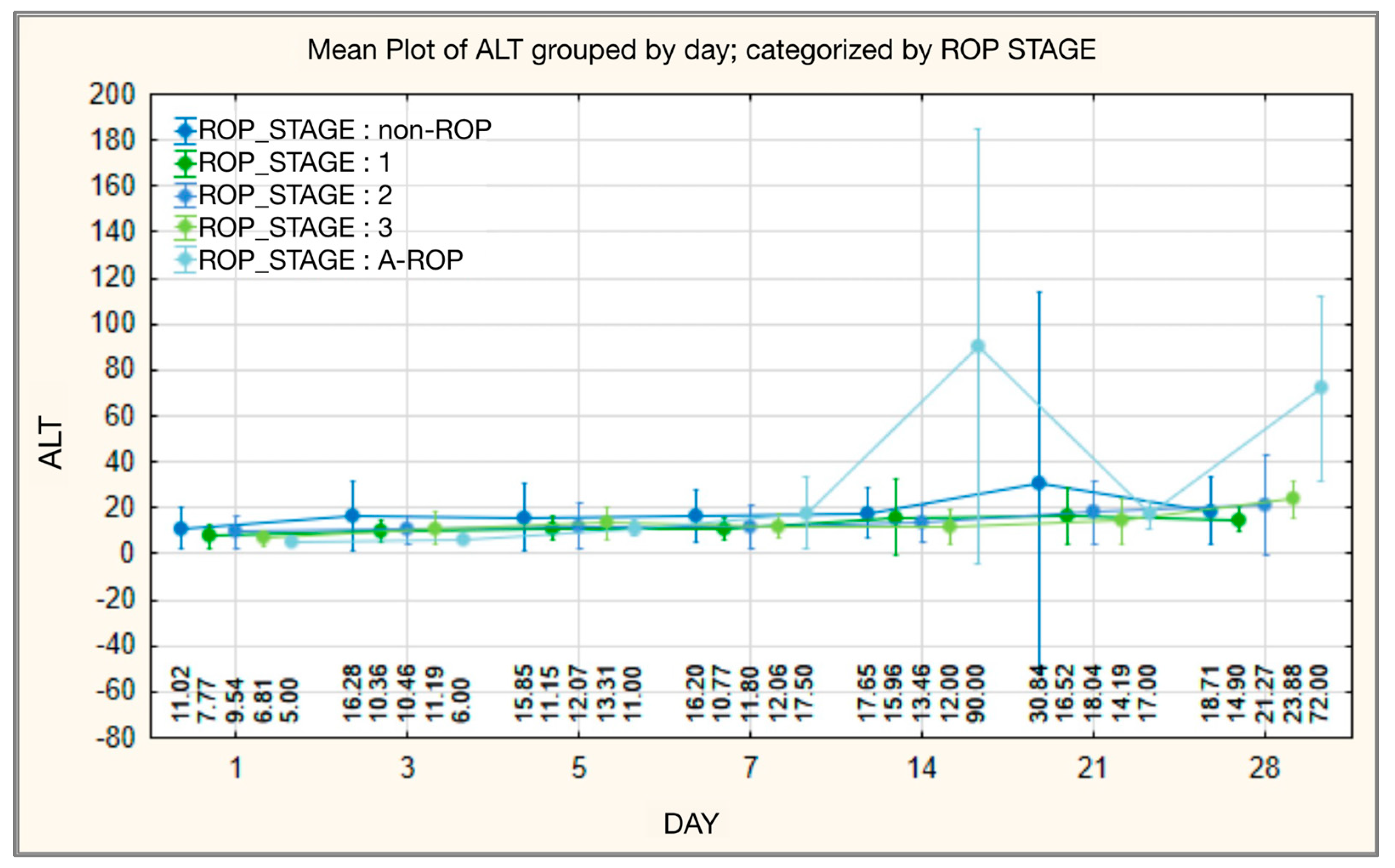 Initially, ALT values did not differ significantly between ROP stages, although the highest levels were recorded in the non-ROP group (mean 11.0208 ± 8.95646; median 8.0000) and the lowest in the A-ROP group (mean 5.0000 ± 0.0000; median 5.0000). On day 3 of monitoring, the differences reached statistical significance, with higher values in the non-ROP group (16.2821 ± 15.35364; median 12.0000) and lower in the A-ROP group (6.0000 ± 1.15470; median 6.0000). The differences between groups diminished on day 5; however, from day 7 onward, ALT values in the A-ROP group rose progressively and became significantly higher than in the other groups. This trend persisted on days 14 and 28, when the A-ROP group showed the highest values (mean 72.0000 ± 40.41533; median 72.0000), while the ROP stage 0 and 1 groups recorded lower levels than those observed in stages 2 and 3 (Table 8, Figure 8).