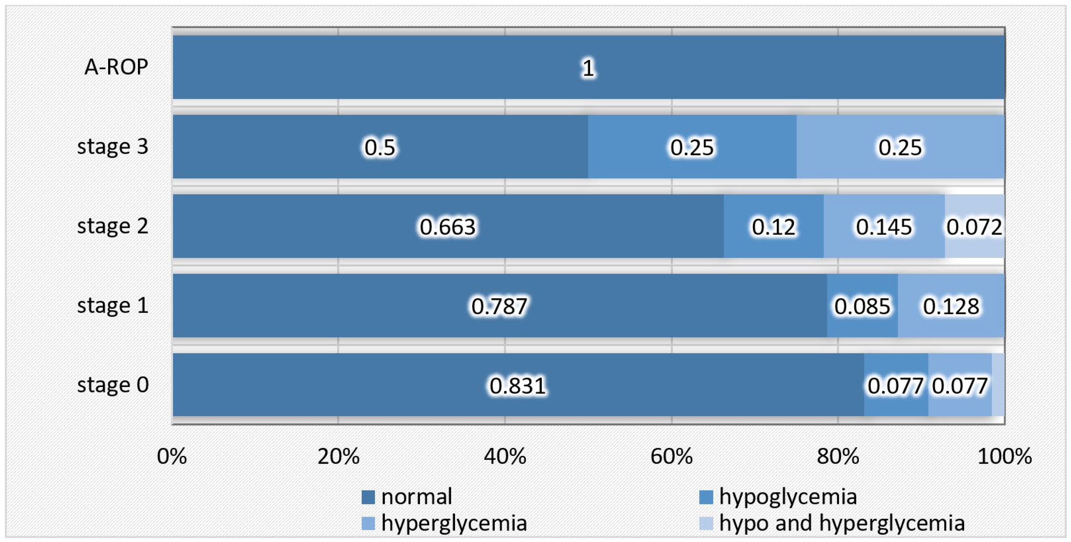 In the A-ROP group, as well as in approximately 80% of cases from the non-ROP and stage 1 ROP groups, blood glucose levels were within the normal range. The proportion of normal values was significantly lower in stage 2 (66.3%) and stage 3 (50.0%), where cases of both hypo- and hyperglycemia were observed more frequently (Table 10, Figure 10).