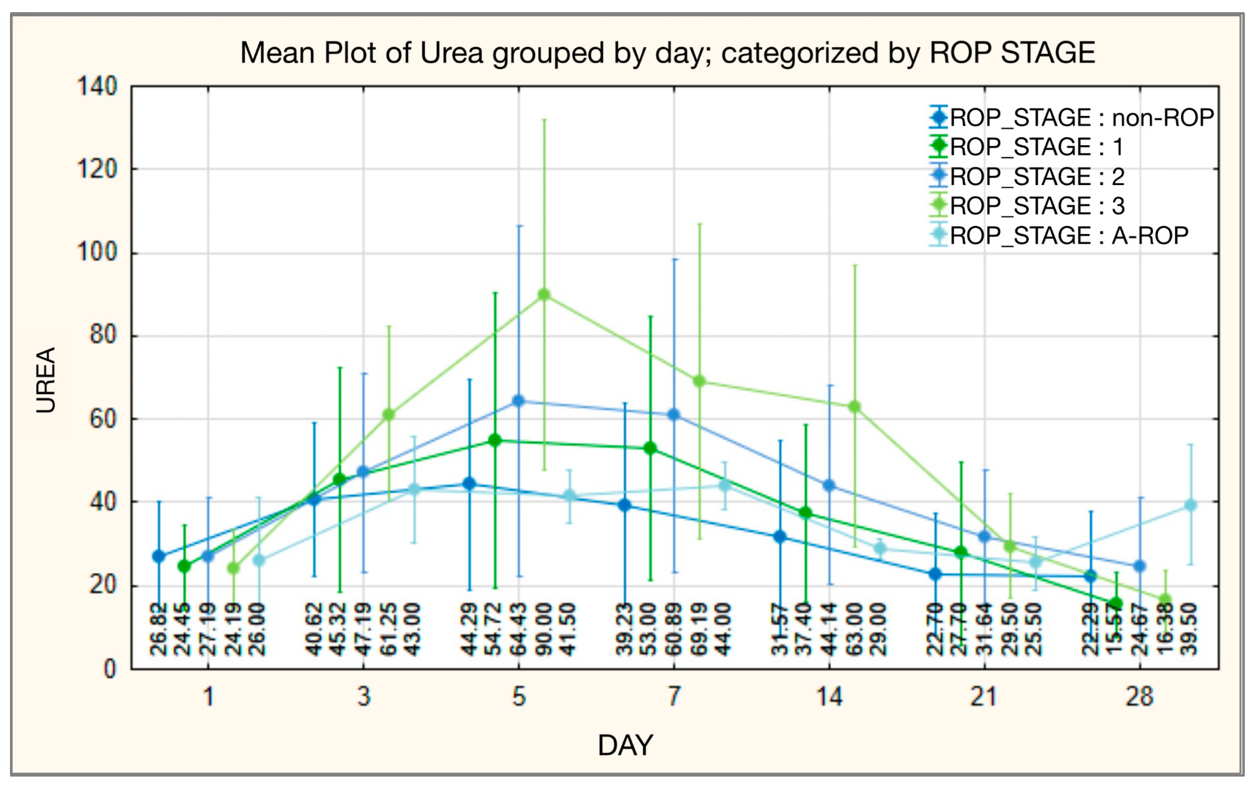 Although initial urea values did not differ significantly among ROP stages, from the third day of monitoring onward they diverged significantly, a pattern that persisted until the end of the observation period. On day 3, values increased progressively with disease severity, with the lowest levels in stage 0 (mean 40.62 ± 18.283; median 38.00) and the highest in stage 3 (mean 61.25 ± 21.174; median 64.00), while the A-ROP group showed intermediate levels (mean 43.00 ± 12.702; median 43.00). The same trend was observed on days 5, 7, 14, and 21, with a gradual decline in values within the A-ROP group. At the end of the period (day 28), the A-ROP group again showed the highest values (mean 39.50 ± 14.434; median 39.50), whereas the lowest were recorded in stage 1 (mean 15.57 ± 7.828; median 13.00) (Table 11, Figure 11).