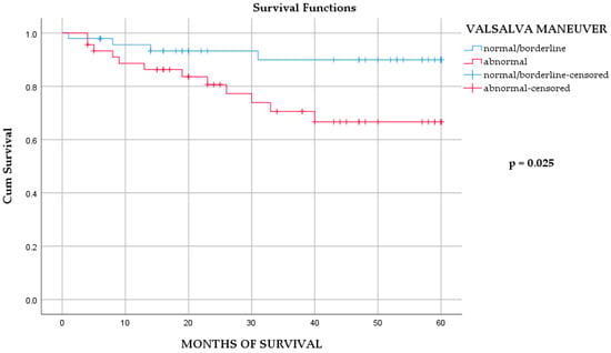 The Kaplan–Meier survival analysis of overall mortality in MI/DM group, according to Valsalva maneuver outcomes. Log-rank test p = 0.025. Number at risk at months 0, 20, 40, and 60: normal/borderline = N0, 32, 8, 0; abnormal = N0, 30, 17, 0.