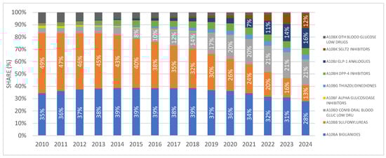 The total consumption of drugs used in diabetes (ATC A10) in Croatia increased from 61.26 DDD/1000/day in 2010 to 117.97 DDD/1000/day in 2024, representing a growth of approximately 92%, or slightly less than twofold, over a 15-year period. In the same period, financial expenditure on A10 medicines rose from €36.66 million in 2010 to €112.46 million in 2024, which corresponds to an increase of more than threefold. This disproportionate growth in expenditure compared to utilization is attributable to the introduction of higher-priced antidiabetic agents into routine clinical practice (Figure 1A,B).