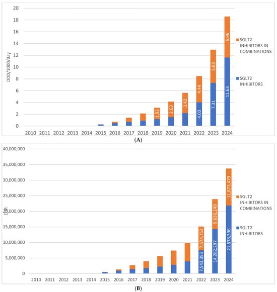 Figure 3. (A) The total use of SGLT2 inhibitors (mono and combinations) from 2010 to 2024. (B) Financial expenditure of SGL2 inhibitors (mono and combinations) from 2010 to 2024. Note: the first SGLT2 inhibitor was introduced to the Croatian market in 2014.