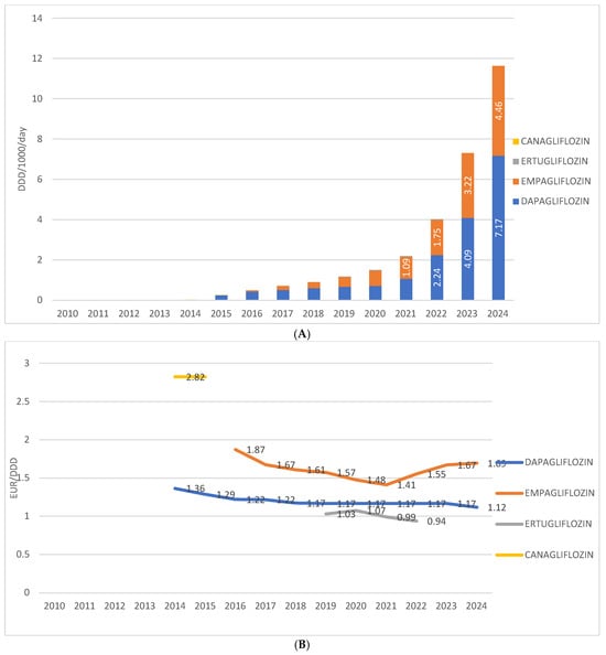 Figure 4. (A) Prescription of different SGLT2 inhibitors from 2010 to 2024. (B) Price per 1 DDD of different SGLT2 inhibitors from 2010 to 2024. Note: the first SGLT2 inhibitor was introduced to the Croatian market in 2014.