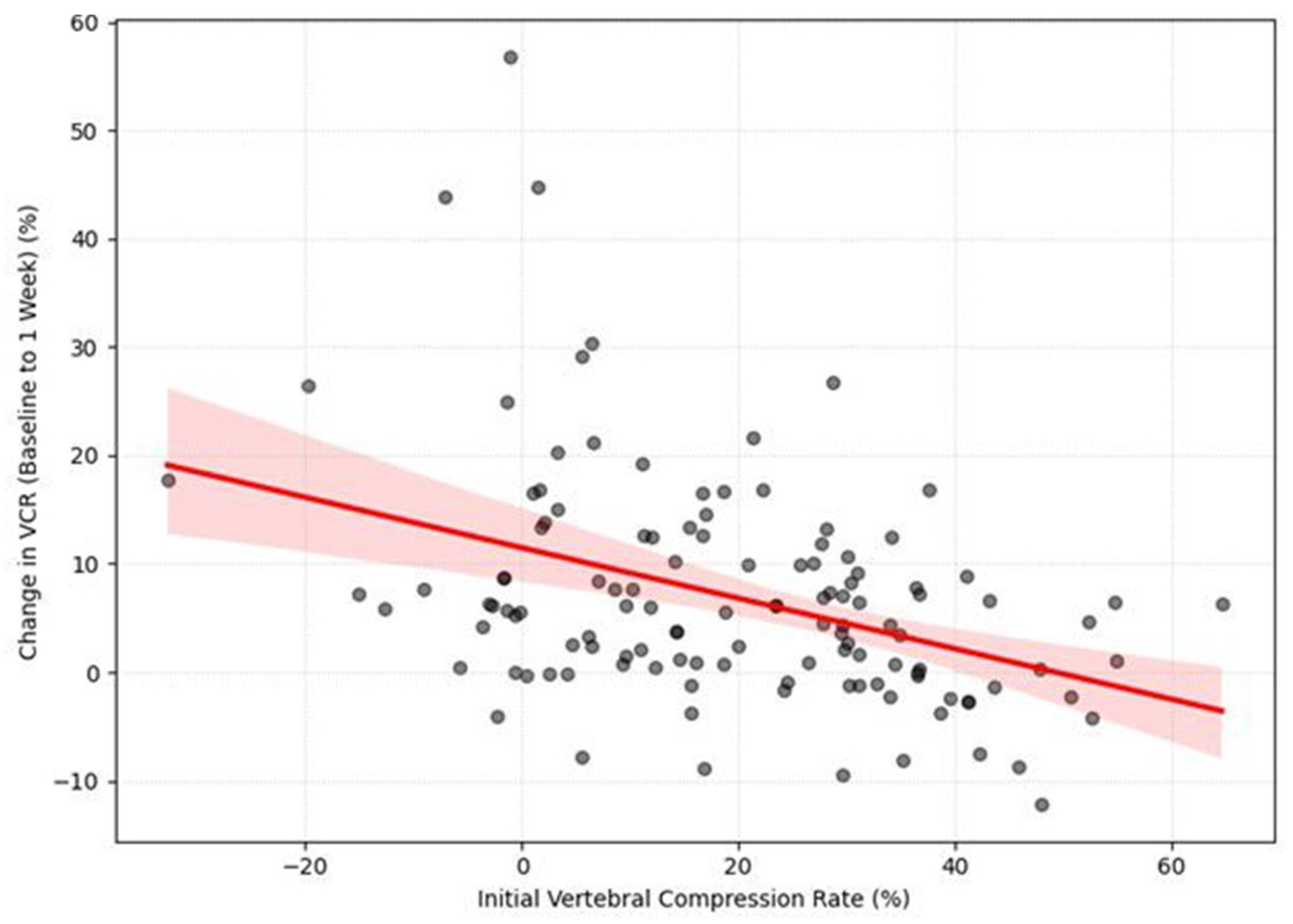 Next, we examined the relationship between the initial VCR and its subsequent progression. A Pearson correlation analysis revealed a significant negative correlation between the initial vertebral compression rate (VCR) and the subsequent change in VCR (ΔVCR) during the first week of follow-up (r = −0.395,