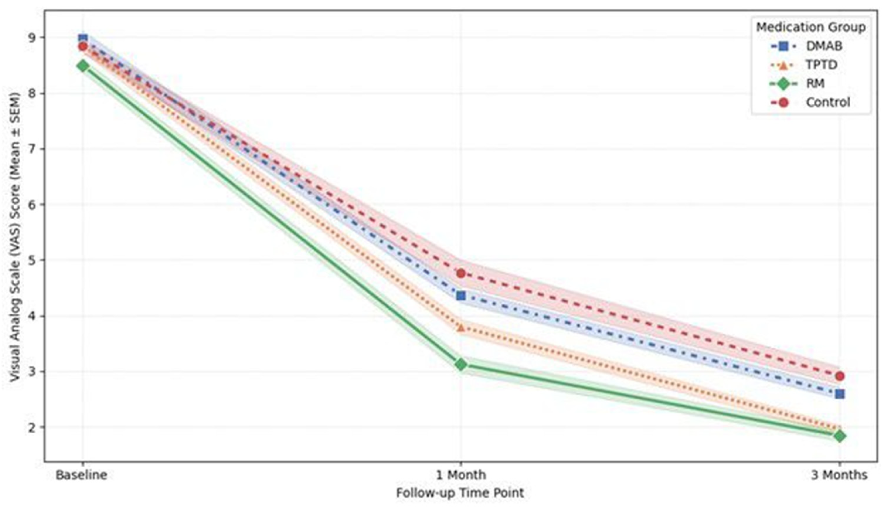 All treatment groups demonstrated significant pain relief over the 3-month follow-up period (ANOVA, p = 0.002). In terms of the absolute reduction in VAS scores from baseline to 3 months, the TPTD group showed the largest mean reduction (6.87 ± 0.78), followed closely by the RM group (6.66 ± 0.97).