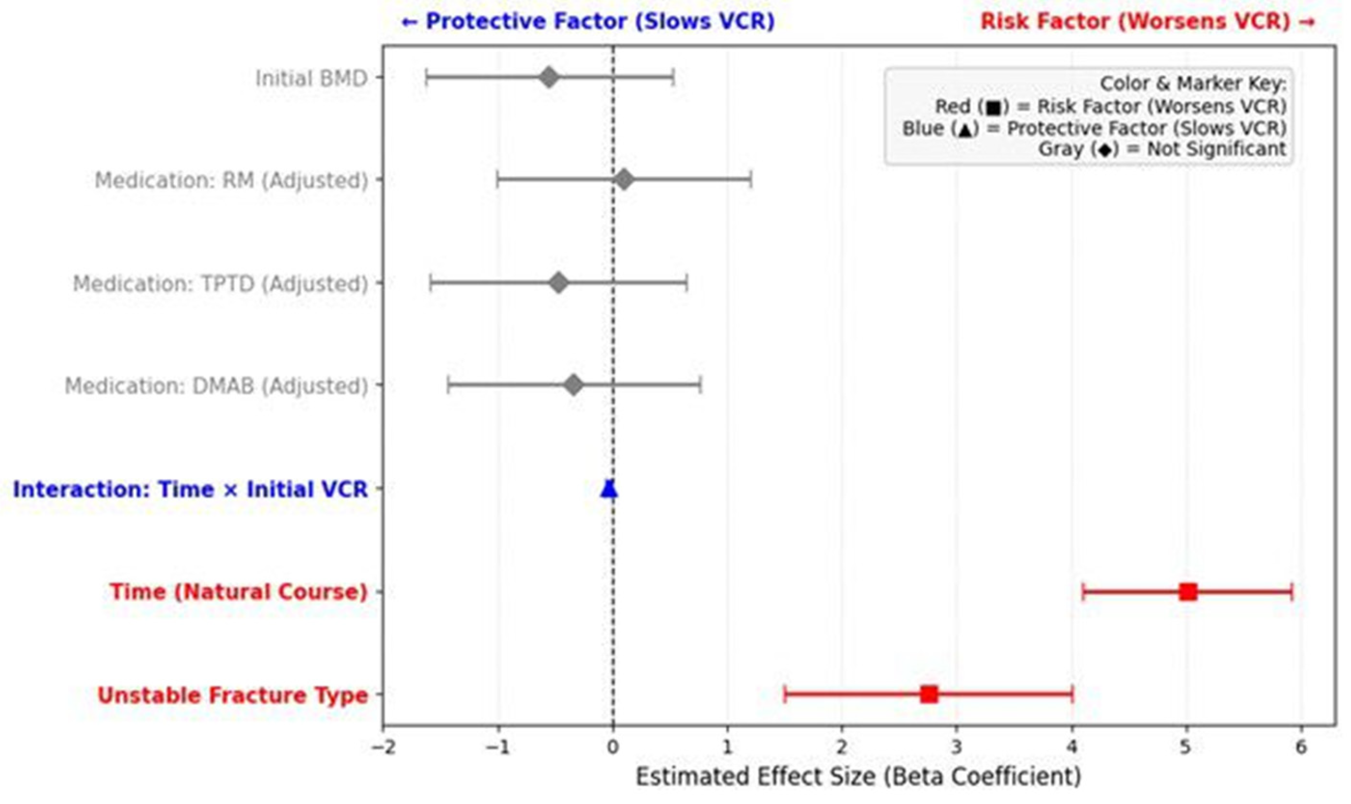 In summary, our adjusted LMM identifies a significant ‘floor effect’ in vertebral progression (β = −0.033, 95% CI: −0.05 to −0.01, p = 0.003). This concept suggests that vertebrae with a higher initial compression rate have a naturally lower potential for additional height loss, as the trabecular bone is already significantly compacted. Conversely, fractures with low initial VCR are at the highest risk for precipitous collapse, emphasizing that the initial degree of severity—rather than the pharmacological regimen—is the primary determinant of the 3-month structural trajectory.