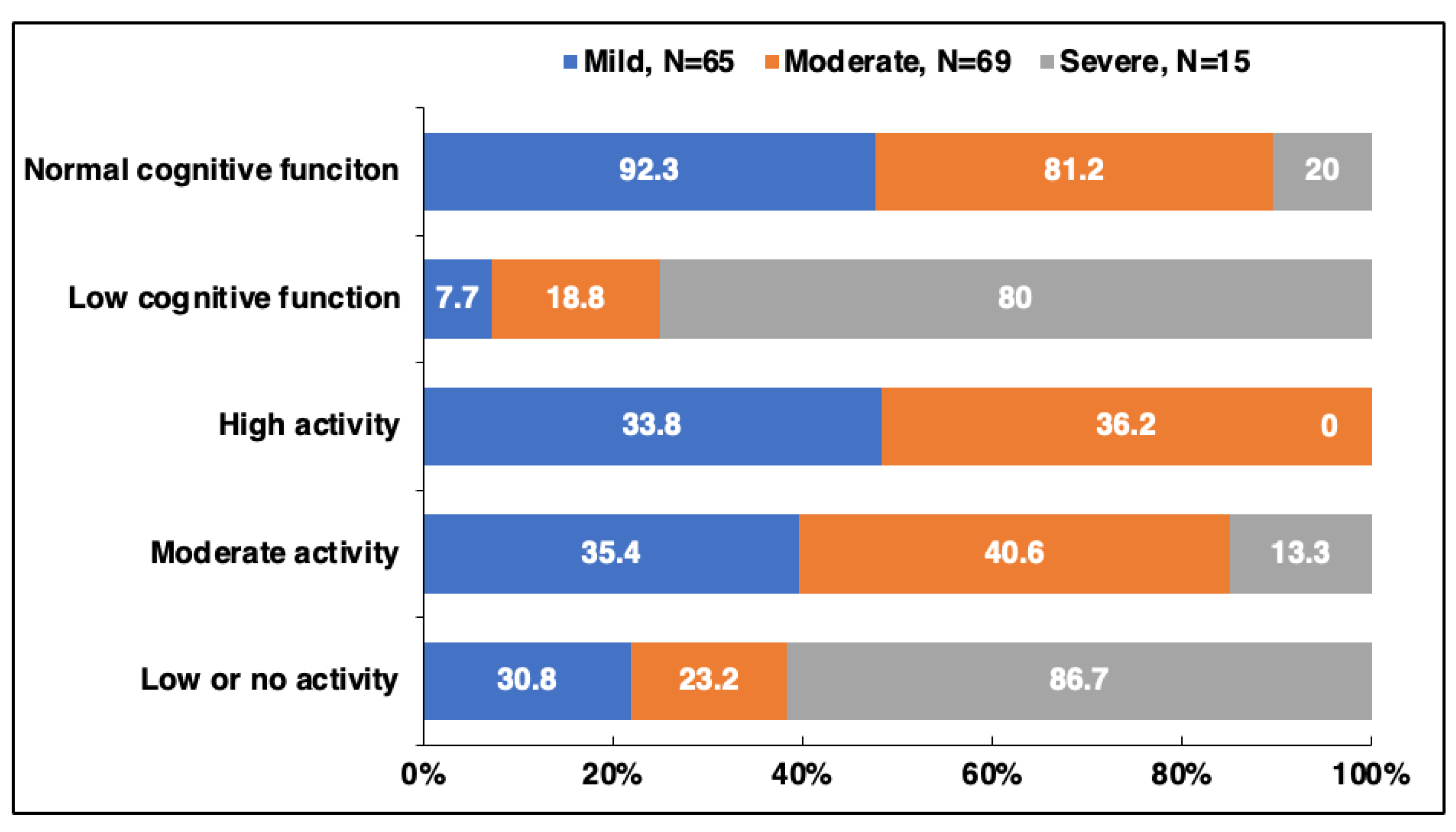 3.3. Distribution of Cognitive Function and Physical Activity by Disability Severity