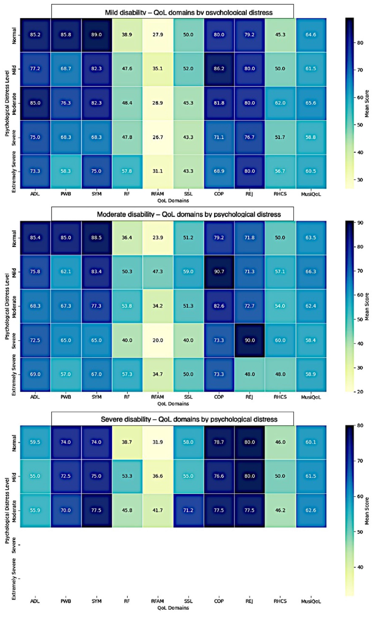 3.6. Heatmap of Quality of Life and Functioning Across Psychological Distress and Disability Levels