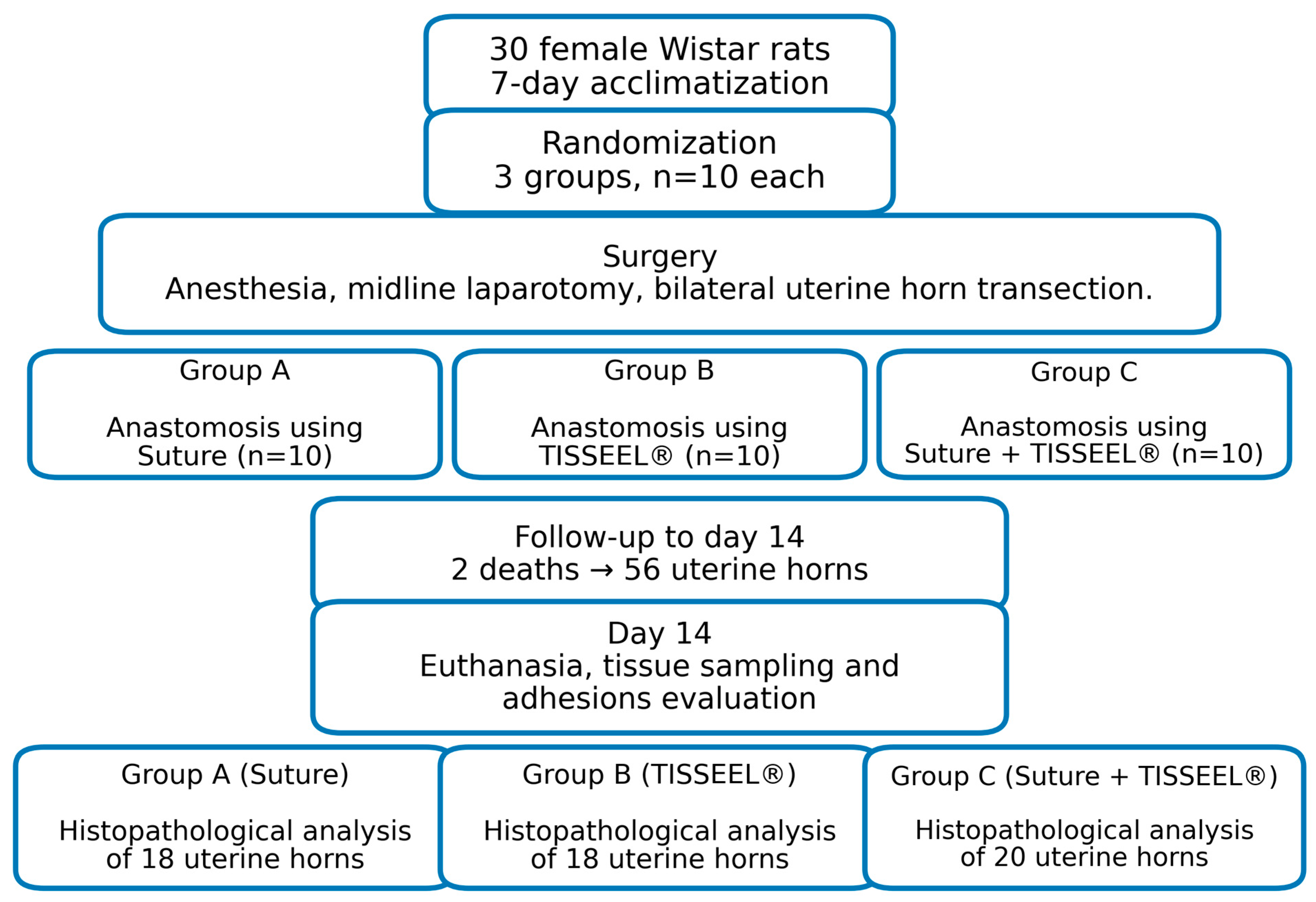 This study has several methodological strengths. First, it examines TISSEEL® effects on tubal reanastomosis healing and adhesion formation using a well-established Wistar rat uterine horn model that is widely used for anastomosis and anti-adhesion research. Second, the study design was balanced, with three experimental groups and random allocation. All procedures were performed using standardized surgical and anesthesia protocols in homogeneous animal cohorts housed under controlled conditions. The evaluation of healing was carried out through two methods, which consisted of blinded macroscopic assessment of adhesion severity and blinded histological examination using the modified Ehrlich–Hunt system. Finally, statistical processing combined ordinal analysis with binary tests to detect fine differences between healing patterns and adhesion severity.