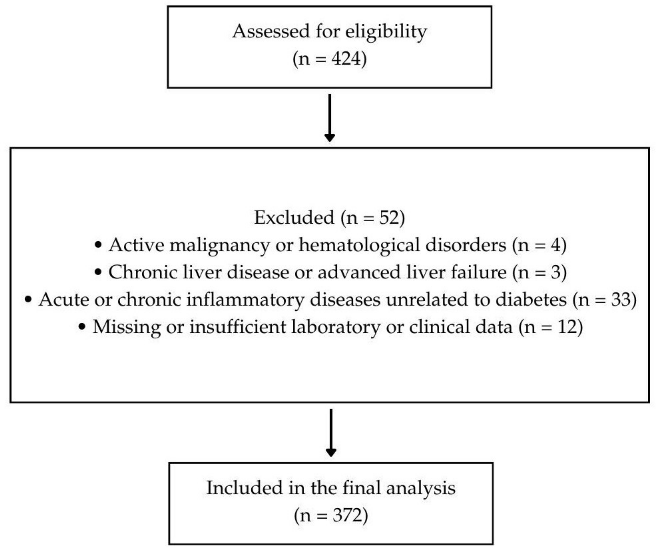 - Acute or chronic inflammatory diseases unrelated to diabetes that may affect inflammation–nutrition indices (e.g., sepsis unrelated to diabetes, autoimmune disorders).