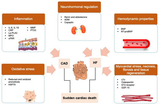 Biomarker pathways involved in sudden cardiac death. Protein biomarkers for research-based assessment of mechanisms related to SCD. Surrogate biomarkers that reflect the development of oxidative stress and inflammation are associated with coronary artery diseases (CAD). As biomarkers that reflect the neurohormonal regulation process, hemodynamic properties and myocardial stress are often associated with heart failure (HF). Adapted from Osman J. et al. [3], distributed under the Creative Commons Attribution (CC BY) license.