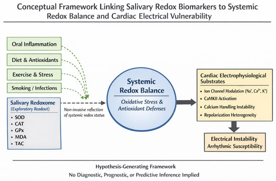 Conceptual framework linking salivary redox biomarkers to cardiac electrical vulnerability. Salivary redox biomarkers are shown as a non-invasive, exploratory reflection of systemic redox balance. Systemic redox imbalance may influence cardiac electrophysiological processes and contribute to electrical vulnerability. This figure is hypothesis-generating and is not intended for diagnostic or predictive use. Original Figure created by the authors.