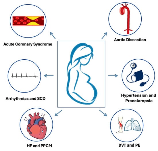The pathophysiological mechanisms underlying CVEs during pregnancy are predominantly associated with hemodynamic and physiological alterations. From the sixth week of gestation and extending into the second trimester, cardiac output (CO) and stroke volume experience an increase of approximately 30% to 50%, accompanied by an elevation in heart rate of 10 to 20 beats per minute and a reduction in peripheral vascular resistance by 20% to 50% [3,6]. Furthermore, plasma volume expands significantly, while red blood cell counts decrease by 30%, resulting in dilutional anemia. Ventricular function remains preserved; however, both ventricular and atrial dimensions are mildly enlarged. This hemodynamic shift, together with the associated cardiovascular structural adaptations and ventricular wall stretch, may contribute to the occurrence of CVEs during pregnancy, such as acute heart failure (HF), aortic dissection, valvular dysfunction, or tachyarrhythmias, particularly in women with known cardiac disease or predisposing cardiovascular risk factors.