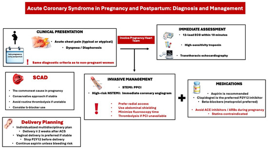 PCI should be performed in cases of atherosclerotic ACS. If PCI is unavailable, thrombolysis may be considered, though it increases the risk of maternal hemorrhage and fetal loss. In cases of myocardial infarction with non-obstructive coronary arteries (MINOCA), conservative management is recommended with further diagnostic tests. After PCI, a dual antiplatelet therapy with aspirin and clopidogrel should be considered. In a conservative approach, monotherapy with aspirin is advised. Antiplatelets should be discontinued several days before planned delivery to prevent epidural hematoma. Overall, recommendations regarding dual antiplatelet therapy after acute coronary syndrome during pregnancy and the duration of anticoagulation are based on limited evidence and are largely extrapolated from general population ESC guidelines (Level of Evidence C). Consequently, management should be individualized, relying on clinical judgment and multidisciplinary decision-making, with careful balancing of maternal and fetal risks. Vaginal delivery is the preferred method if the patient is clinically stable with preserved ventricular function, and delivery should be delayed for at least 2 weeks after an ACS. Finally, there is an evidence gap regarding the necessity and safety of statins in pregnant women with established cardiovascular disease.
