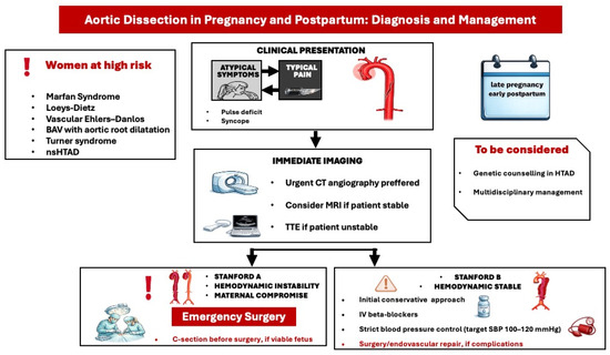 Preventing aortic dissection in women with thoracic aortic disease during pregnancy and the postpartum period remains fundamentally crucial. According to recent ESC guidelines, women diagnosed with aortic disease should be provided with comprehensive counseling concerning the risks of aortic dissection during both pregnancy and the postpartum phase [4]. An expanded multidisciplinary Pregnancy Heart Team must deliver pre-conception counseling to women with a prior history of aortic dissection or surgical intervention, addressing the heightened risks while considering factors such as genetic variant presence and type, aortic morphology, growth rate, and the underlying etiology of the dissection. Before conception, it is recommended that women with known or suspected aortic pathology undergo a computed tomography (CT) or cardiovascular magnetic resonance (CMR) scan of the entire aorta. For pregnant women with aortic disease who present at least an intermediate mWHO cardiovascular risk level, serial echocardiography is advised for ongoing monitoring. Strict and individualized blood pressure management should be maintained in pregnant women with known aortic dilation, a history of dissection, or pathogenic/likely pathogenic (P/LP) genetic variations associated with aortic disease. In cases involving women with Marfan syndrome and other heritable aortic disorders, the use of beta-blockers during pregnancy and postpartum is recommended, accompanied by rigorous monitoring of fetal growth. Beta-blockers were found to be associated with less aortic root growth during pregnancy in 20 patients with Marfan syndrome [19].